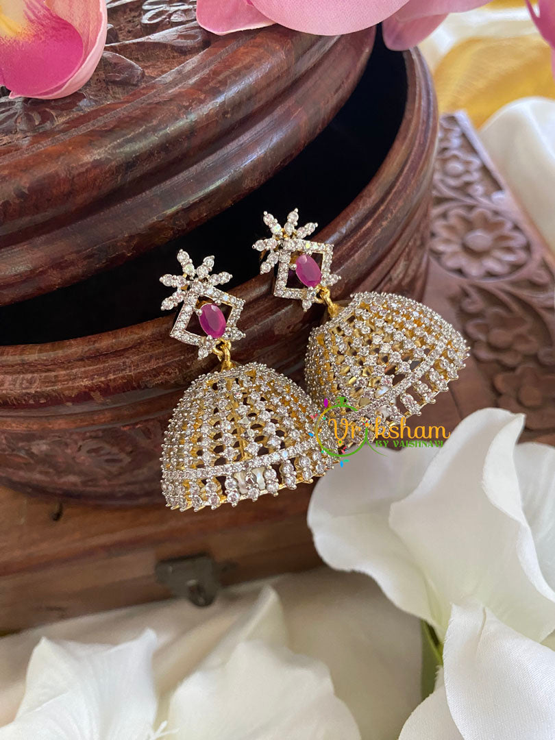 American Diamond Jhumkas -Dice-Red, complete AD stone studded jhumkas. Regular size Jhumkas.