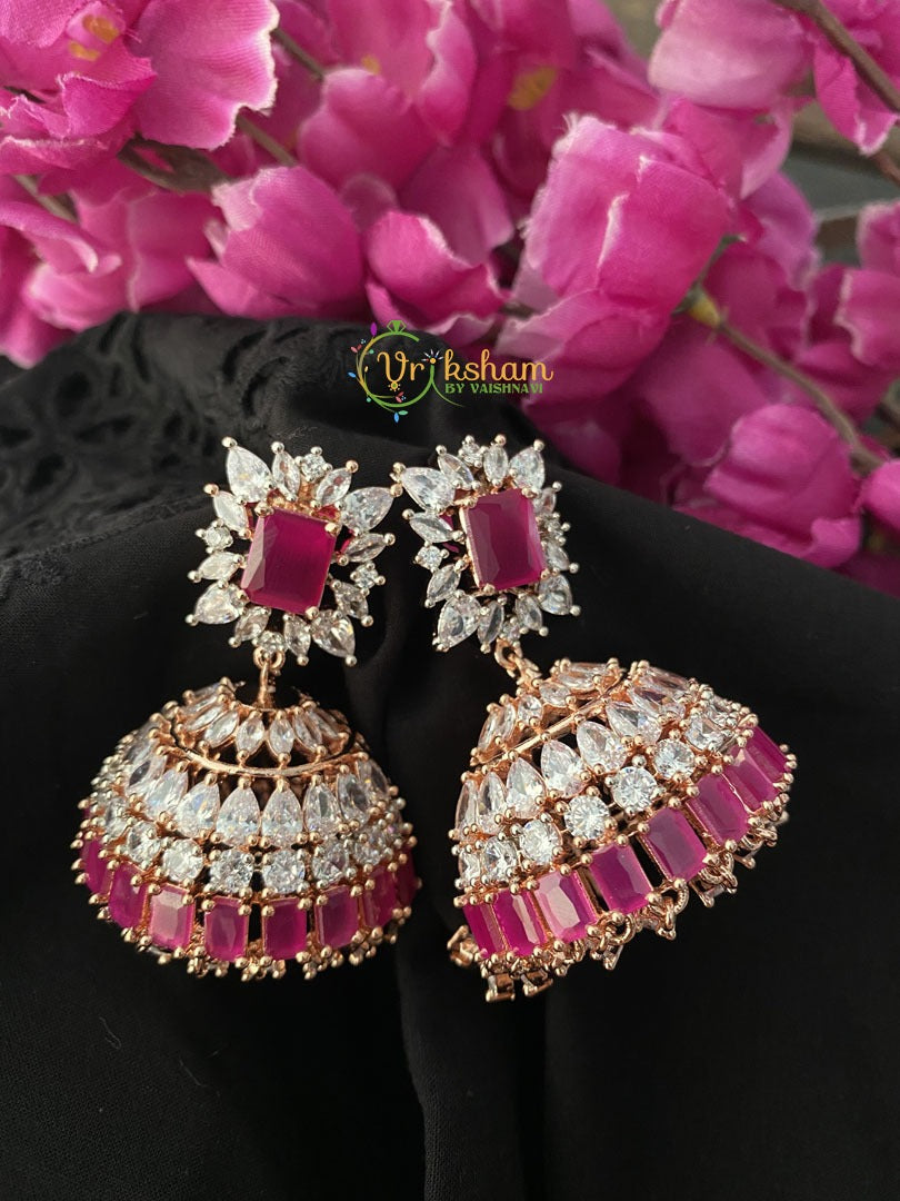 American Diamond Jhumkas - Pink stone Jhumkas with AD stone studded around. Regular size Jhumkas.