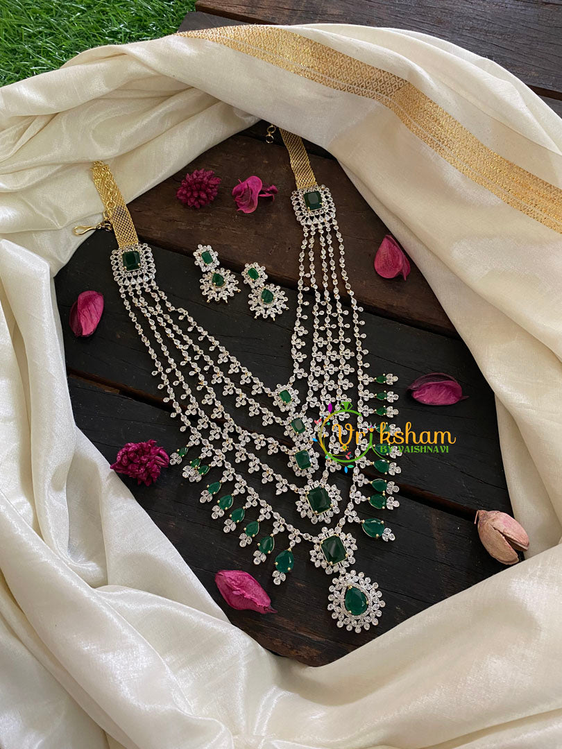 Royal American Diamond Layered Haram-GREEN AND WHITE stone set with Pendant ends. Comes with matching danglers.