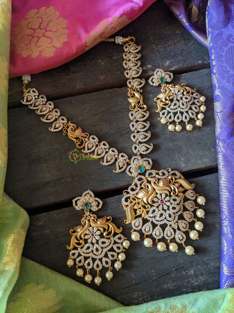 MAKE MATERIAL – This beautiful American Diamond Peacock mid length Neckpiece with earrings is made of gold look alike finish with AD stones.