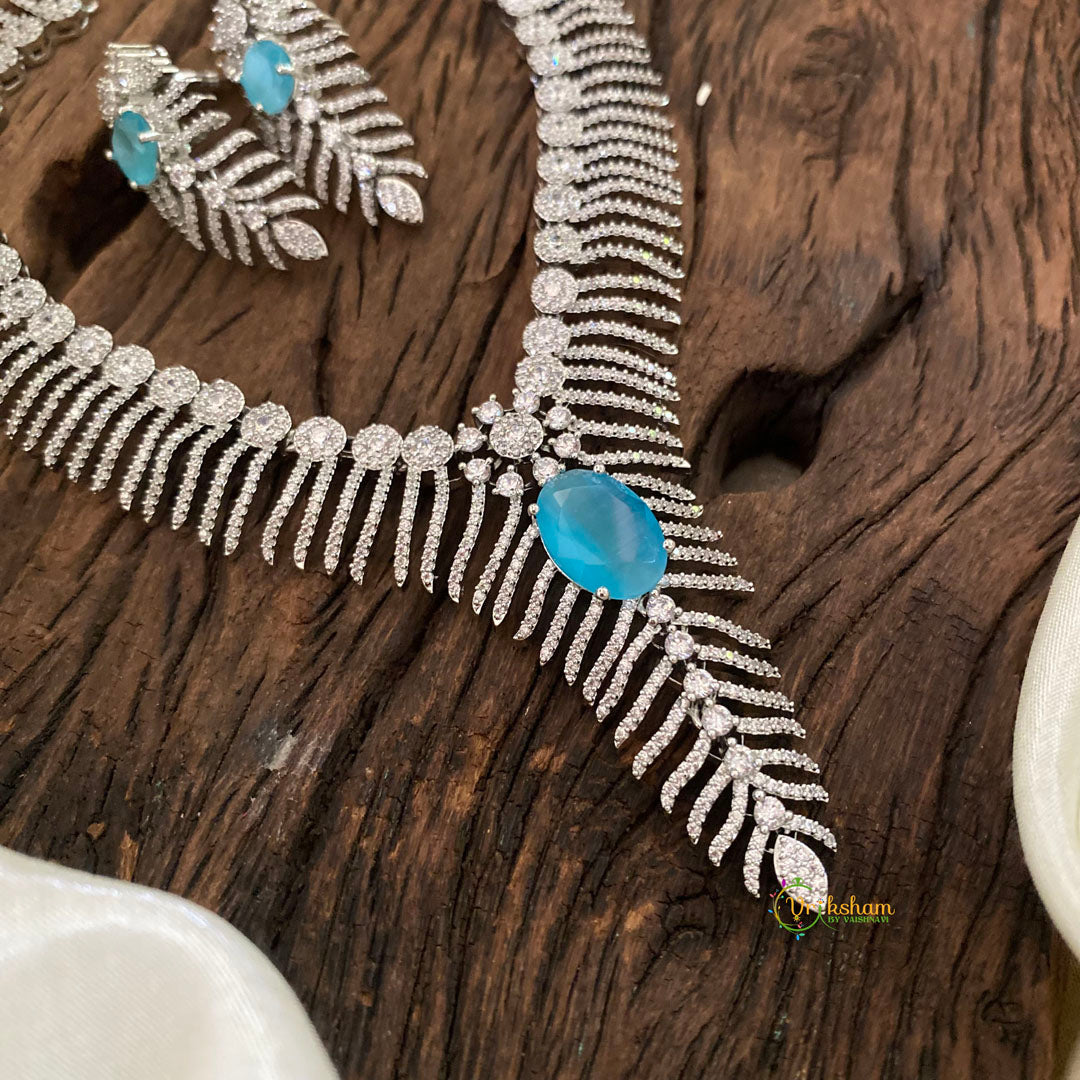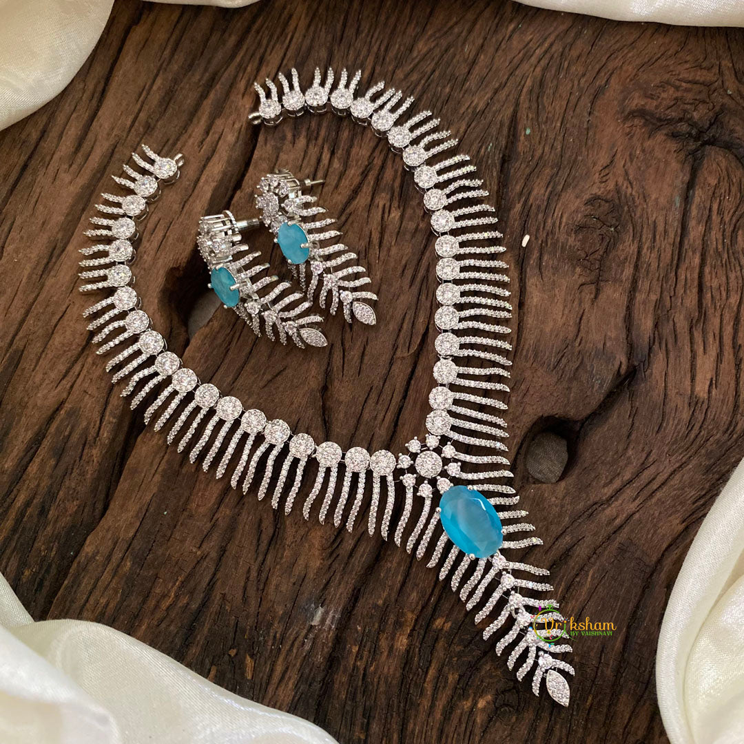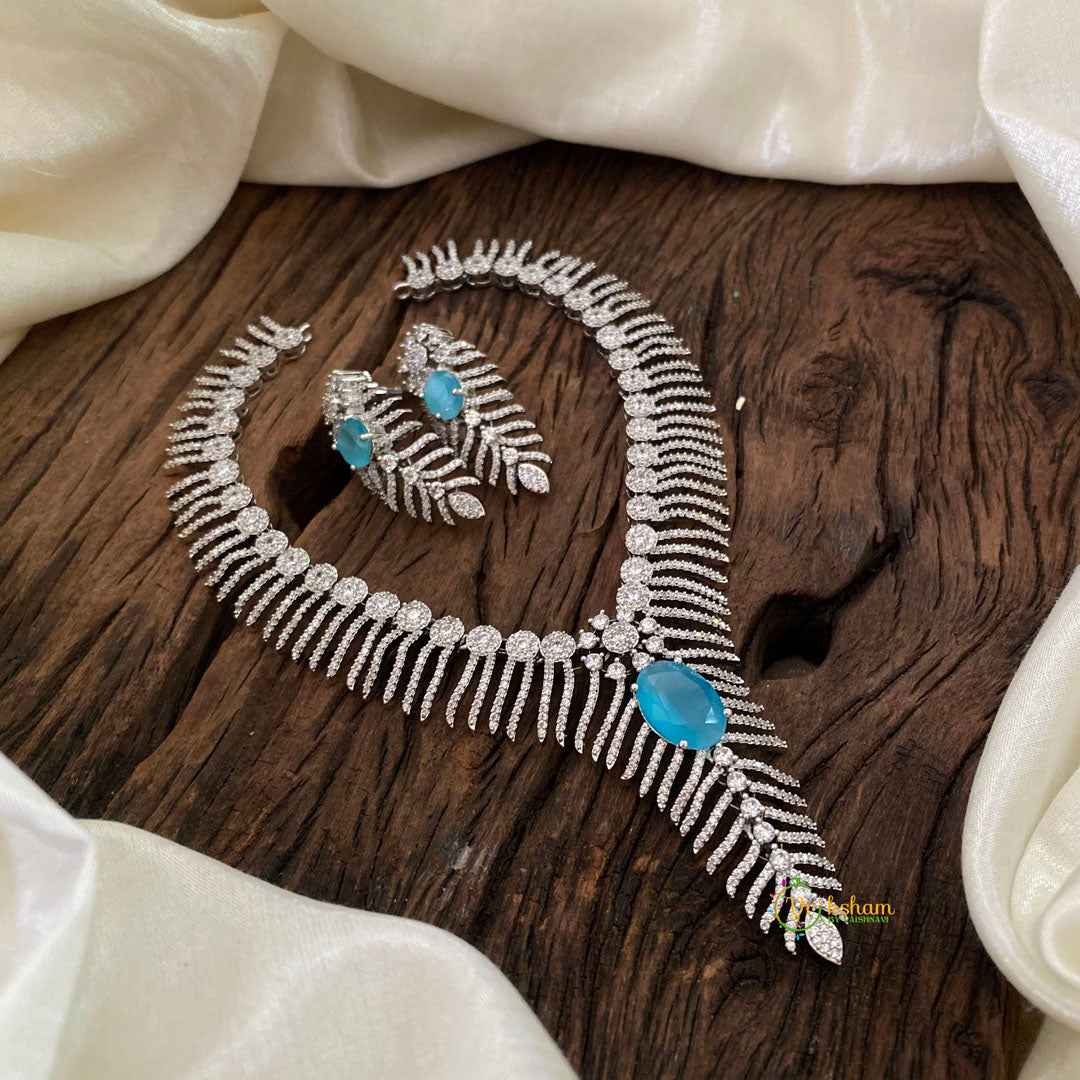 Bridal American Diamond Short Neckpiece -Bridal Neckpiece -imitation white ad stone with color centre stone ; and matching danglers. White Silver Tone.