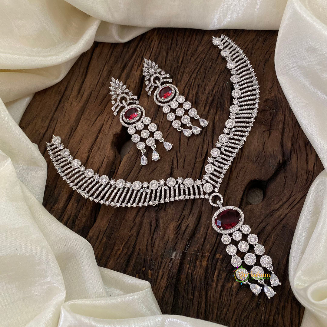 Bridal American Diamond Short Neckpiece -Bridal Neckpiece -imitation white ad stone with color centre stone ; and matching danglers. White Silver Tone. Make material: Bridal American Diamond Short Neckpiece -Bridal...