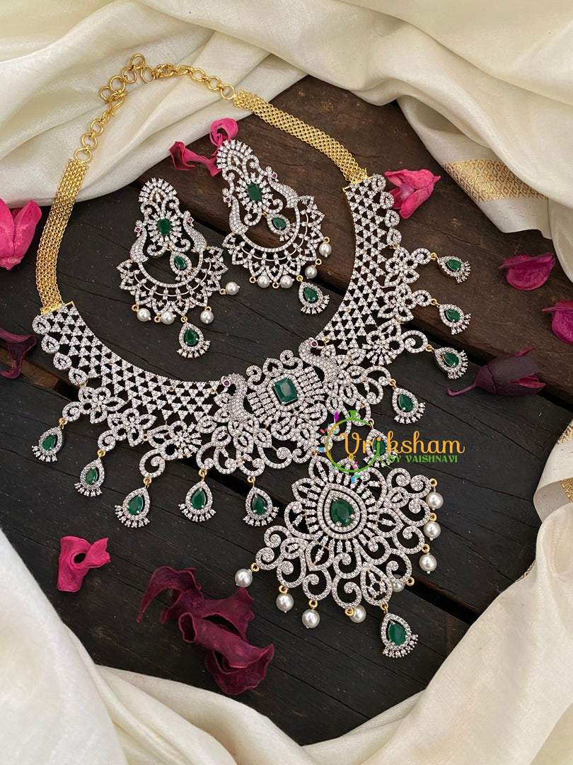 GreenStones Bridal American Diamond Short Neckpiece and matching danglers. Tilak stone Pendants across the length. Gold tone polish short neckpiece.