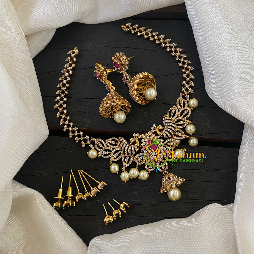 Interchangeable Stones American Diamond Short Neckpiece - white, red, green and blue interchangeable AD stone removable jewelry ; comes with earrings