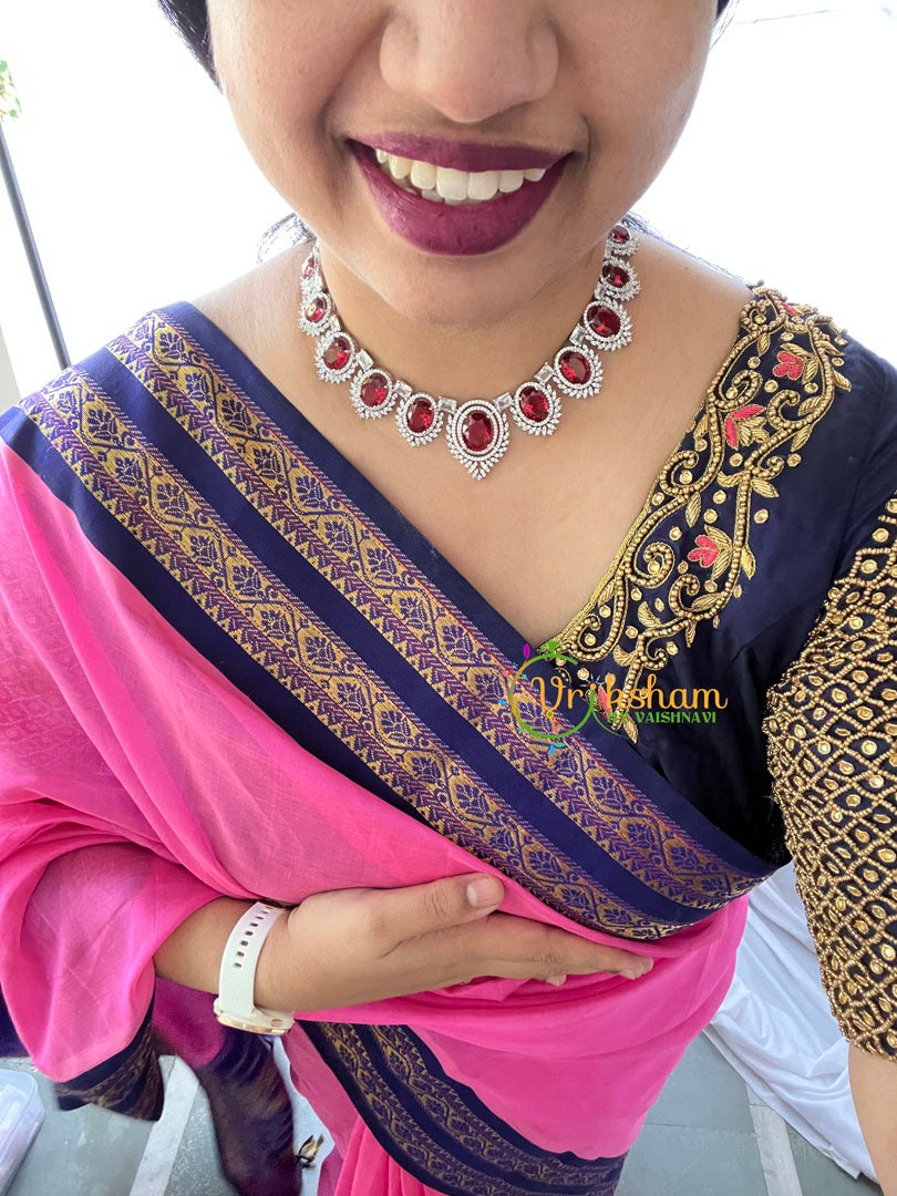 Premium American Diamond Short Neckpiece- Red stone pendant and matching danglers. WHITE TONE polish short neckpiece.