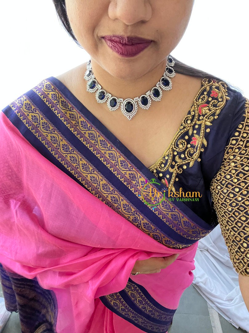 Premium American Diamond Short Neckpiece- Blue stone pendant and matching danglers. WHITE TONE polish short neckpiece.