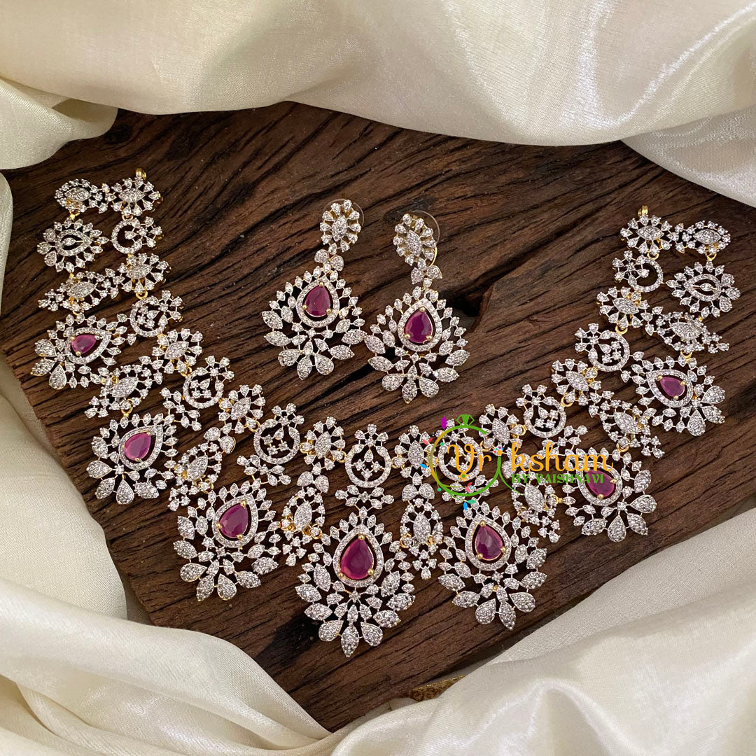 Premium American Diamond Short Neckpiece- Red stone pendant and matching danglers. Gold Tone polish short neckpiece.