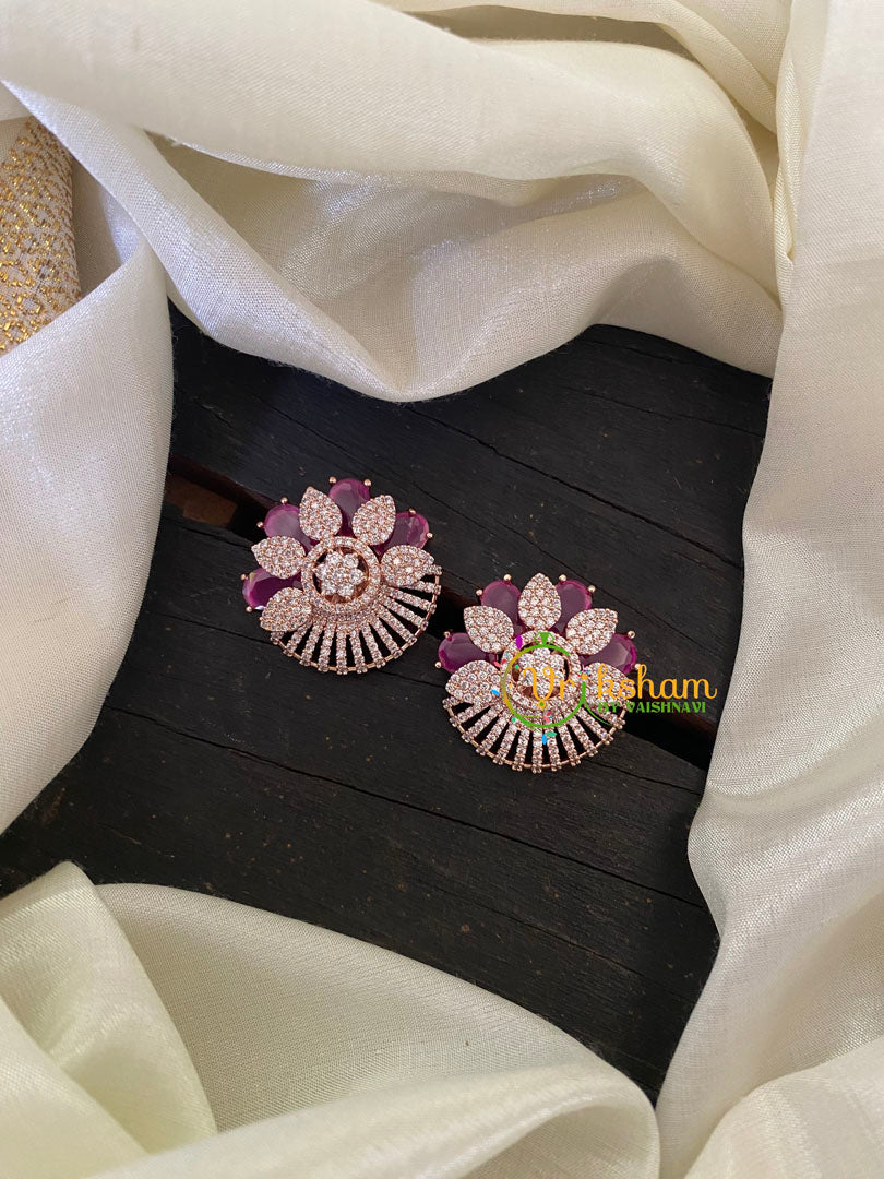 Maroon Rose Gold American Diamond Stud -Designer wear ad earrings; comes as a pair.
