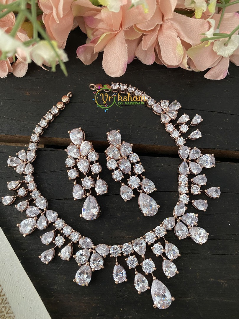Premium American Diamond Tear Drop Choker-Gold Tone color neck choker with white stone set, ear danglers. Gold tone polish.