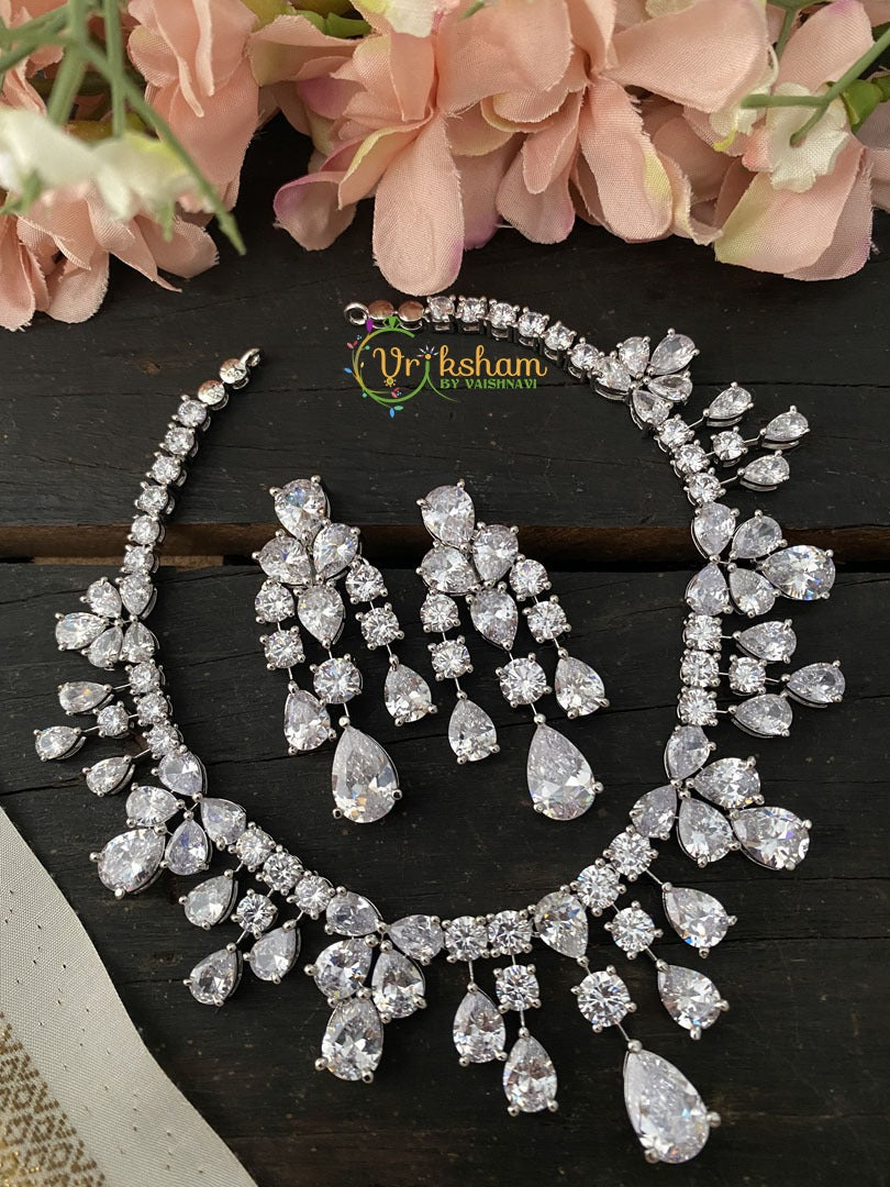 Premium American Diamond Tear Drop Choker-White Tone color neck choker with white stone set, ear danglers. White Tone polish.