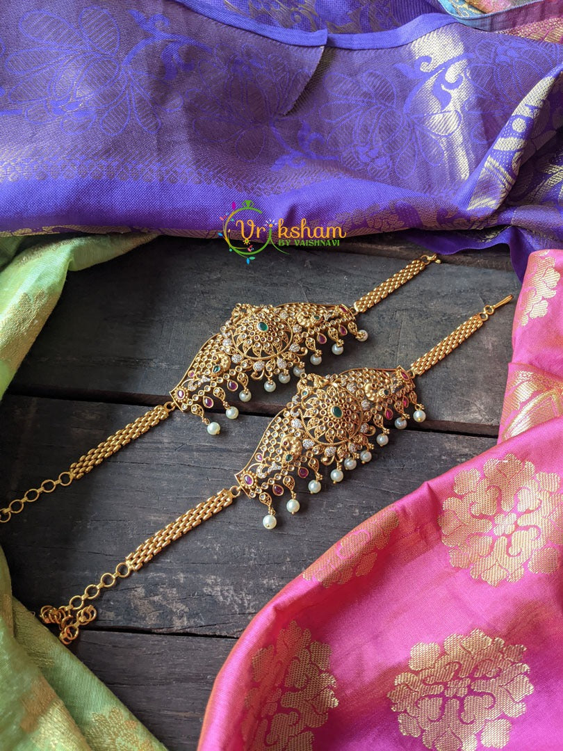 American diamond traditional vangi/armlet with pearl finish with belt finish and centre green stone.