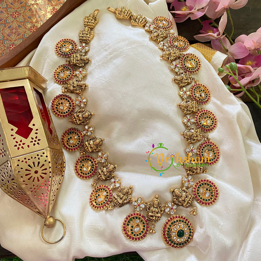 Antique Gold Coin Style Temple Haram – One gram gold polish -Hand moulded -closed back neckpiece– studded with semi-precious stones with Lakshmi, coins with peacock pattern long necklace; Comes as NECKPIECE ONLY.