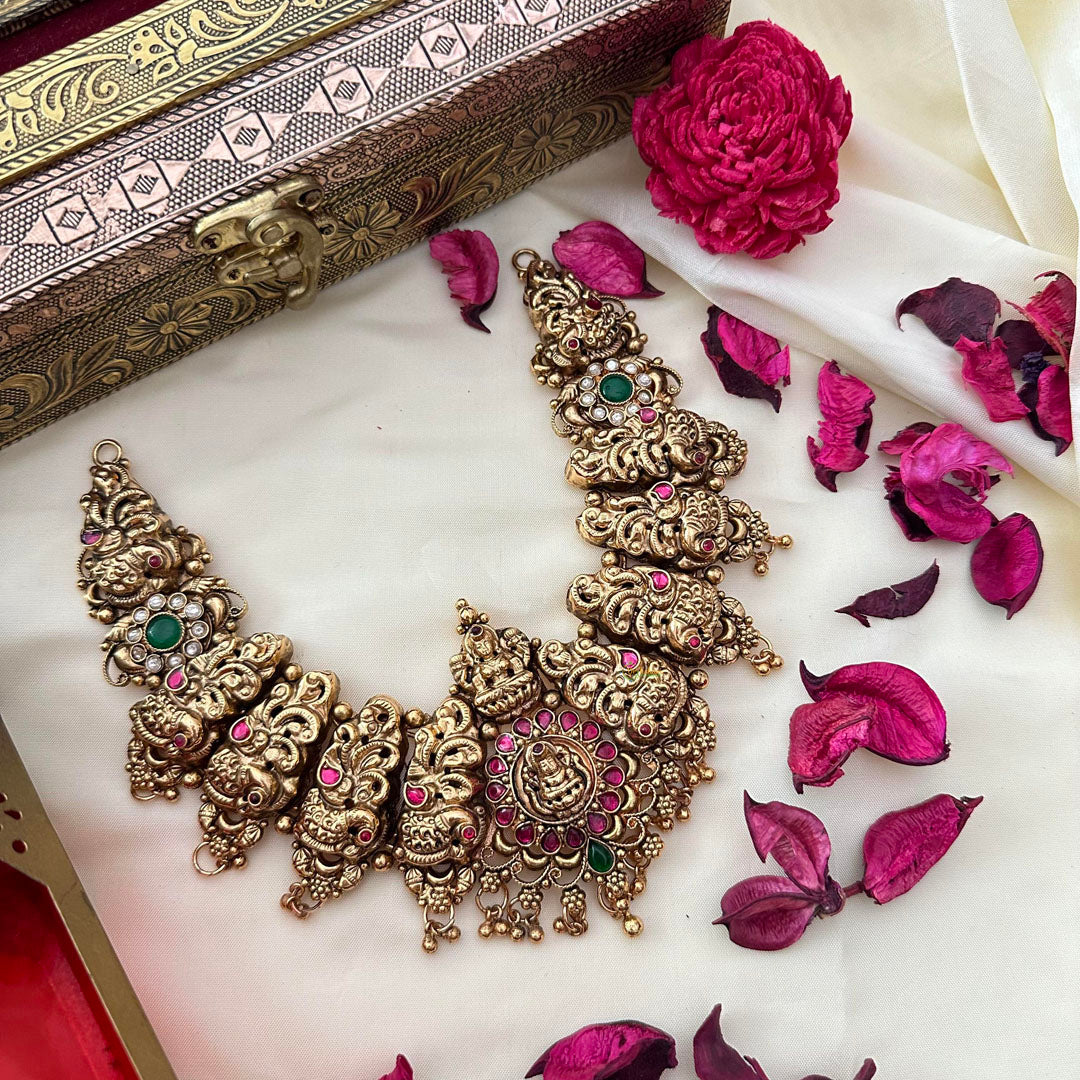 Elevate your style with our Antique 1 gm Gold Mayil Lakshmi Neckpiece. Crafted from stunning gold beads, this exclusive design exudes sophistication and luxury. Perfect for any occasion, it promises to add a touch of elegance to your ensemble. Embrace the beauty of timeless art with this exquisite neckpiece.