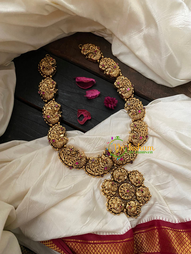 Antique Mid Length Neckpiece-Peacock pendant and length– One gram gold polish -Hand moulded -closed back neckpiece– complete peacock pattern - studded with semi-precious real kemp stones with peacock pendant. NECKPIECE ONLY.