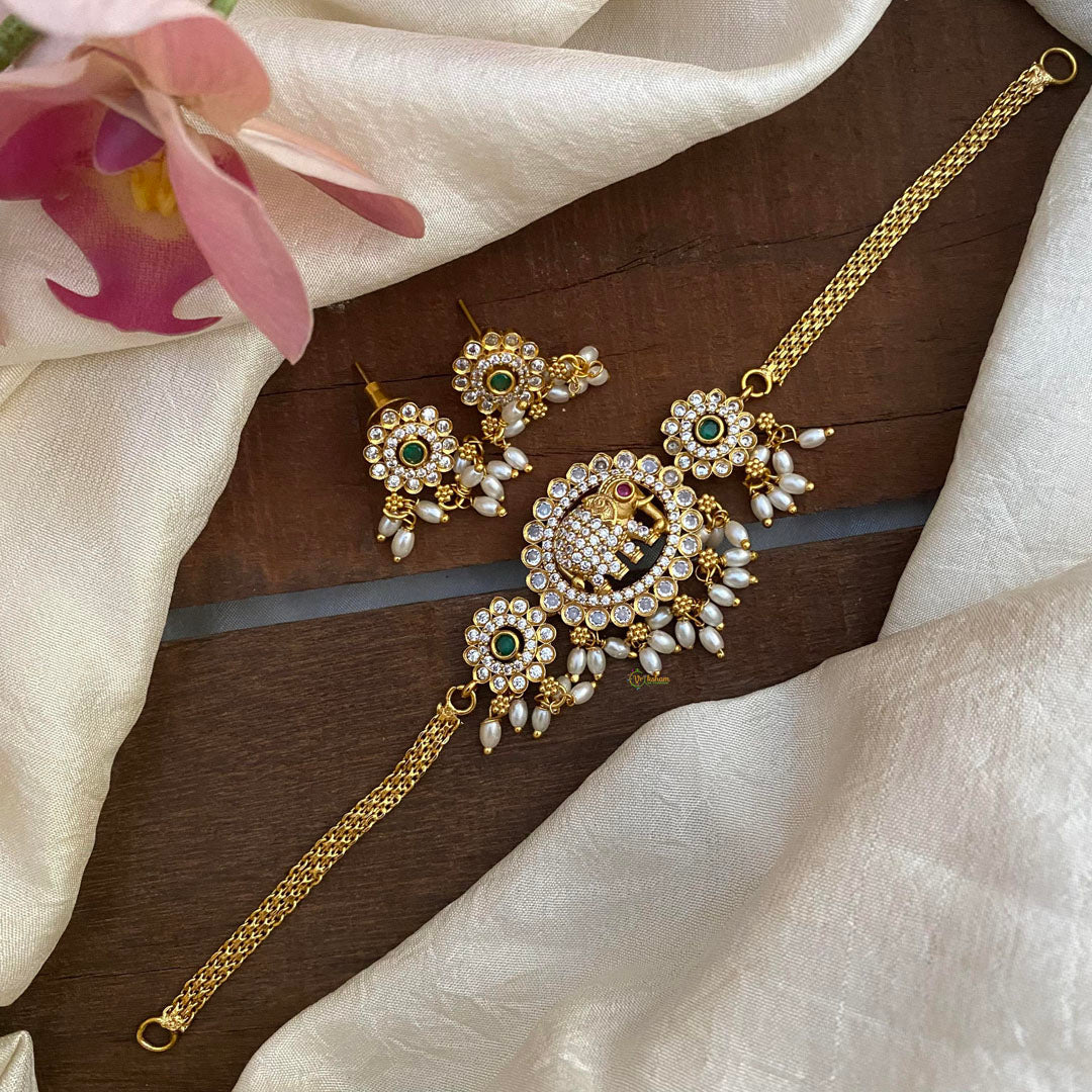 Add a touch of elegance to any outfit with our Antique AD Stone Elephant Choker. The intricate design and stunning green stones make this choker a statement piece. It also comes with matching earrings for a complete look. Elevate your style with this beautiful and unique piece!