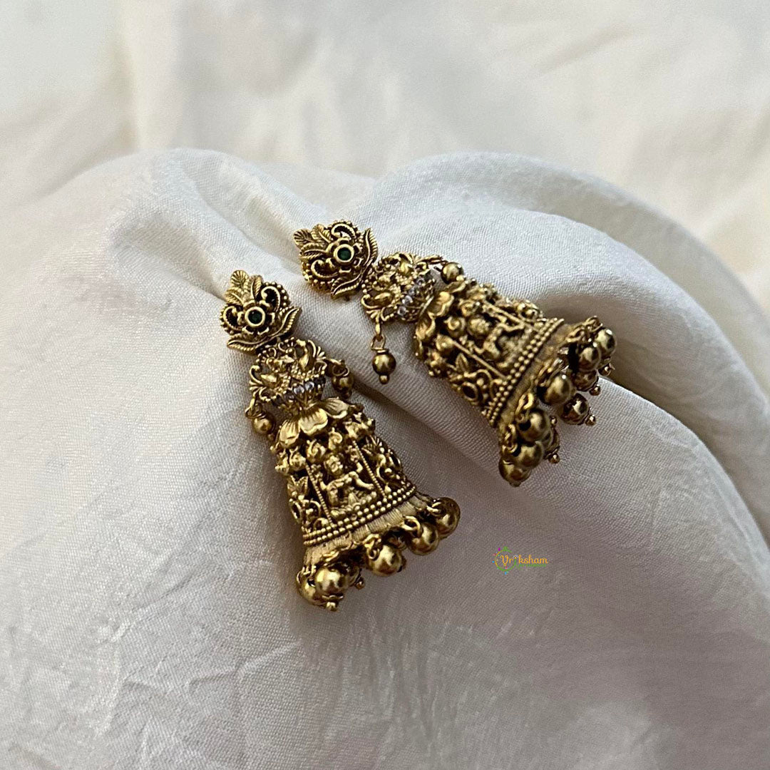 Add a touch of elegance to your outfit with our Antique AD Stone Temple Jhumkas. Featuring a beautiful lakshmi dual peacock and floral design, adorned with Golden Pearls and a pop of red and green stones. Perfect for any occasion, these jhumkas are a must-have for any jewelry collection.