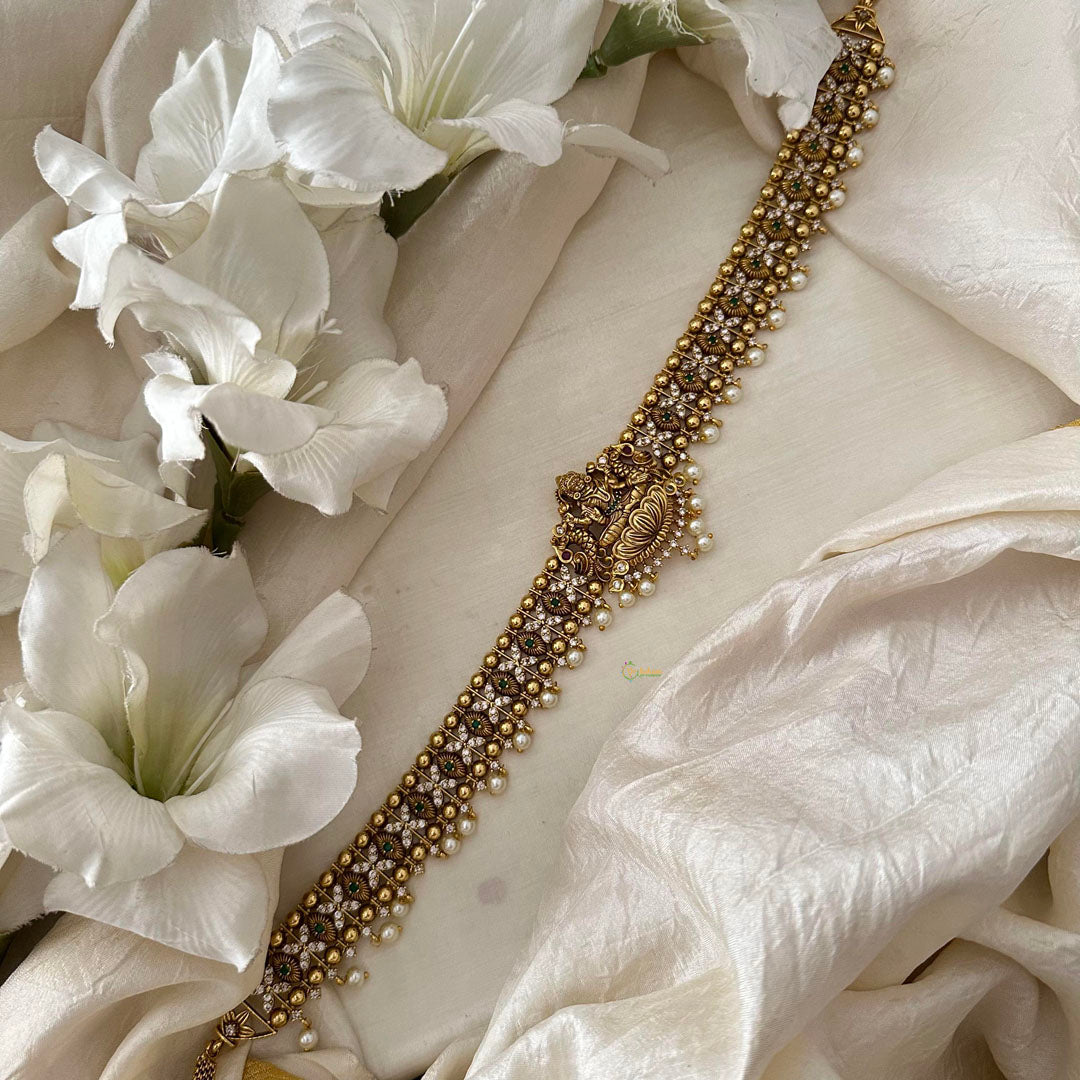 Elevate your style with our Antique Dual Peacock Lakshmi Pendant Hip Chain-Pearl- This unique piece features an American diamond stone pendant adorned with dual peacock Lakshmi motif, adding a touch of elegance. The pearl finish and floral design on the chain make this hip chain a must-have for any fashion-forward individual. Don't miss out on this one-of-a-kind accessory!