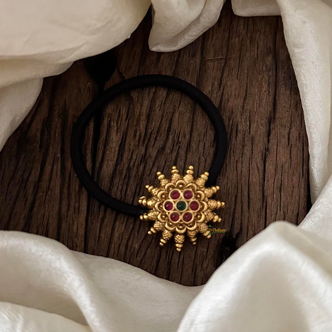 Elevate your style with our Antique Gold Alike Festive Rubber Band! This elegant surya-inspired accessory is adorned with stunning red and green stones, adding a touch of sophistication to any outfit. Say goodbye to boring hair days and hello to effortless charm.
