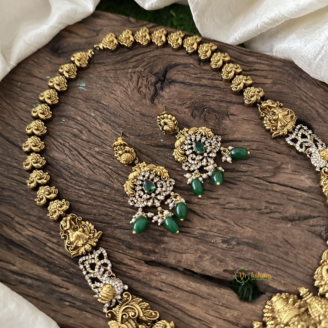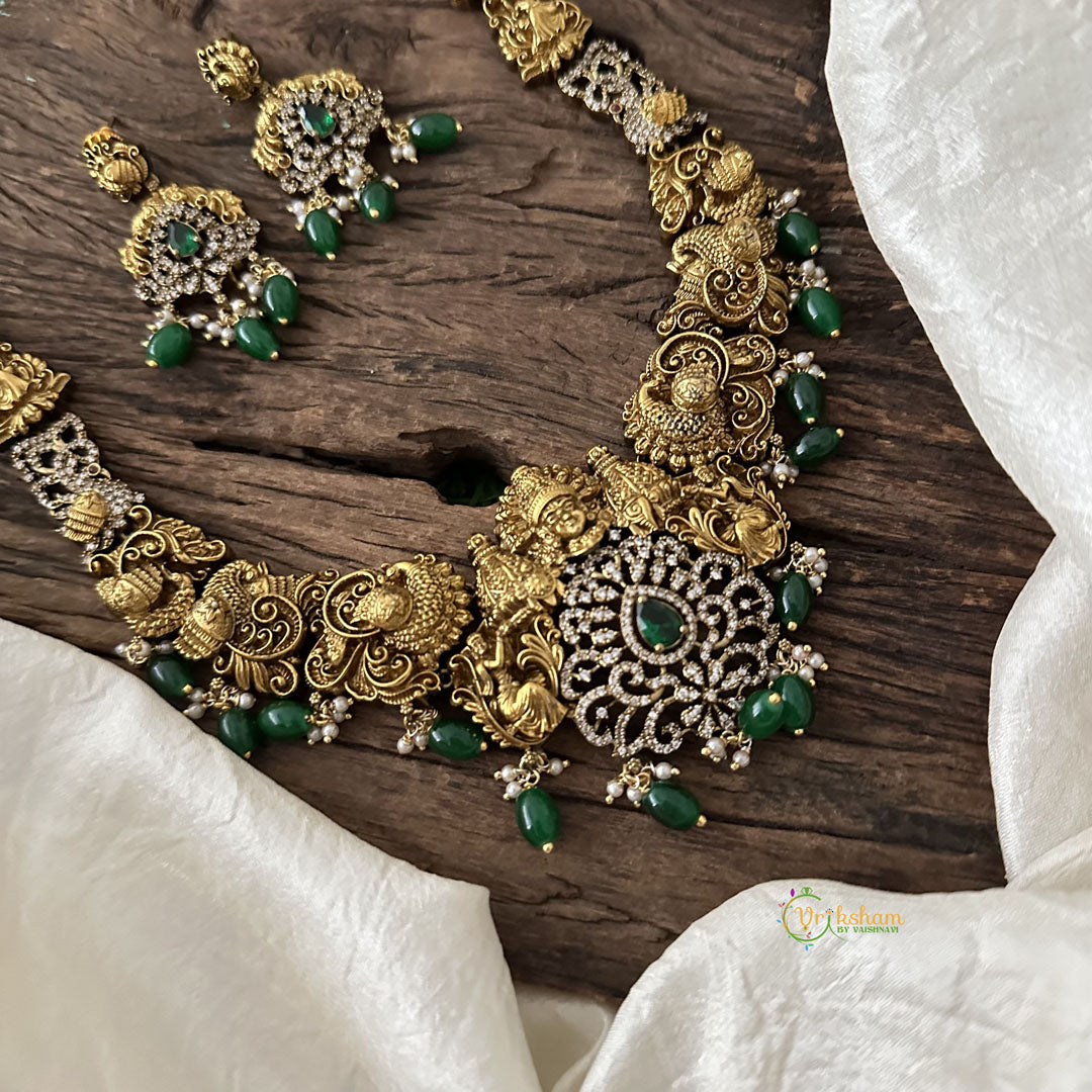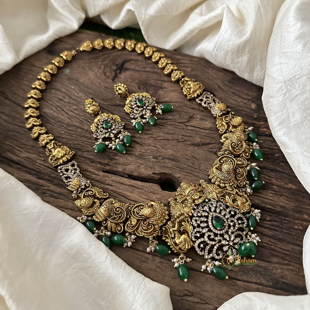 Elevate your style with our Antique Gold Alike Victorian Diamond Long Neckpiece. The pendant's stunning antique gold design and intricate white diamond detailing add a touch of elegance. Paired with beautiful green beads, this neckpiece is the perfect addition to any outfit. Transform your look and feel empowered. Comes with matching earrings.