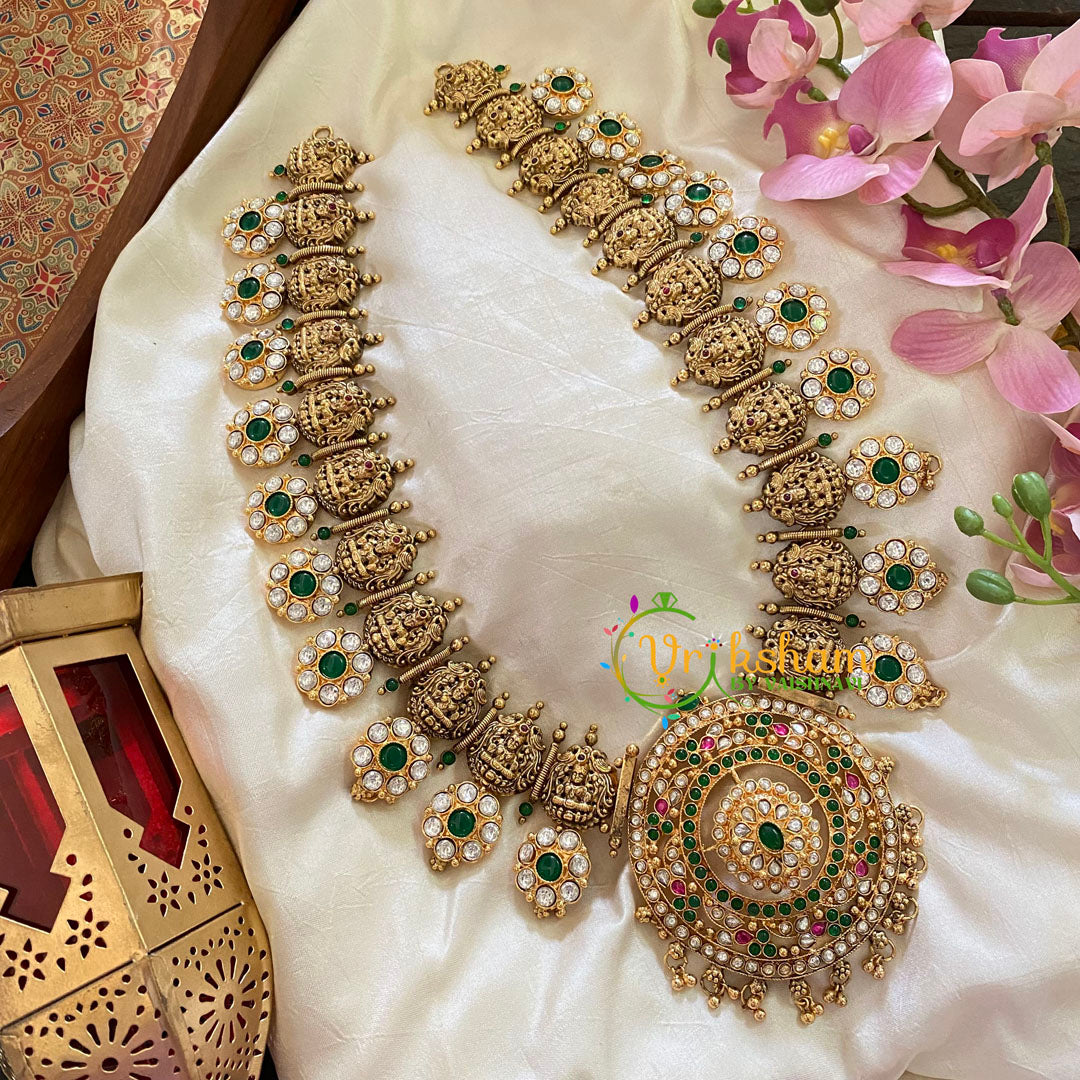 Antique Gold Coin Style Lakshmi Temple Haram– One gram gold polish -Hand moulded -closed back neckpiece– complete coin pattern - studded with semi-precious stones with centre round pendant with ghungroo finish. NECKPIECE ONLY.