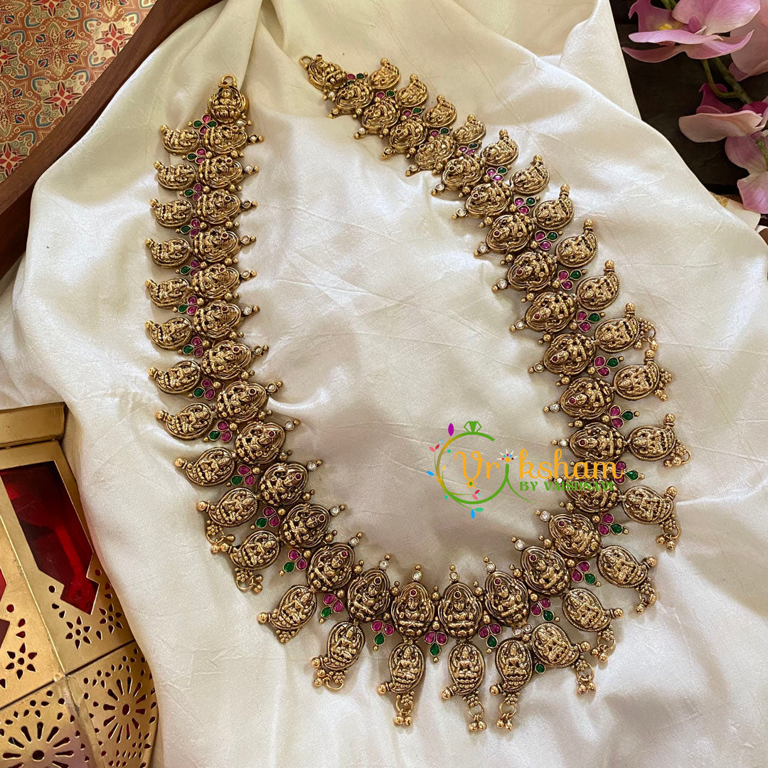 Antique Gold Lakshmi Maanga Malai - Temple Haram– One gram gold polish -Hand moulded -closed back neckpiece– complete maangai and lakshmi pattern - studded with semi-precious real kemp stones with Lakshmi iun maanga pattern ; NECKPIECE ONLY.