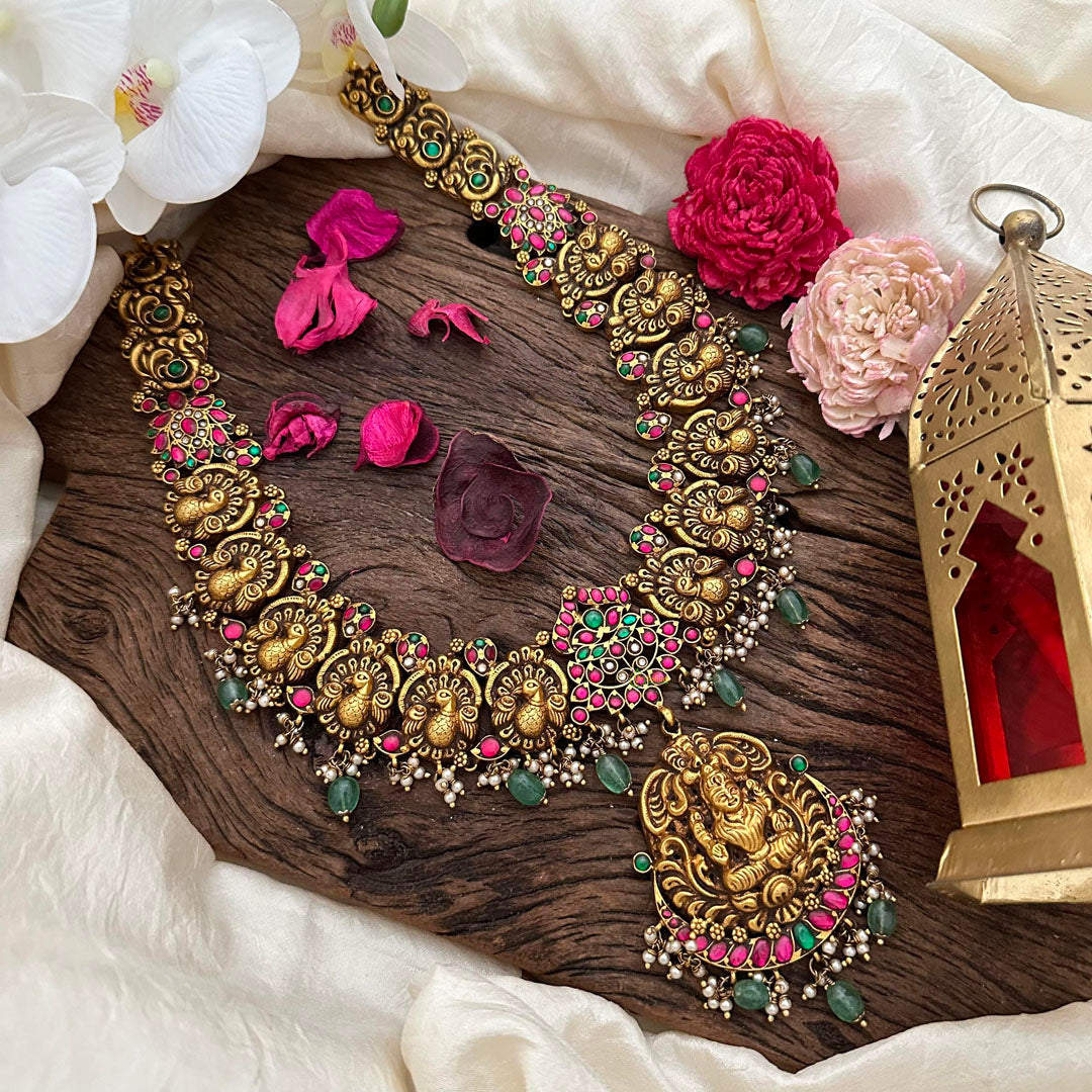 Indulge in luxury with our Antique Jadau Kundan Lakshmi Mayil Haram. Handcrafted with intricate details, this piece features stunning pearl and aqua green beads, creating a timeless and elegant look. Elevate your style with this exclusive and sophisticated jewelry.