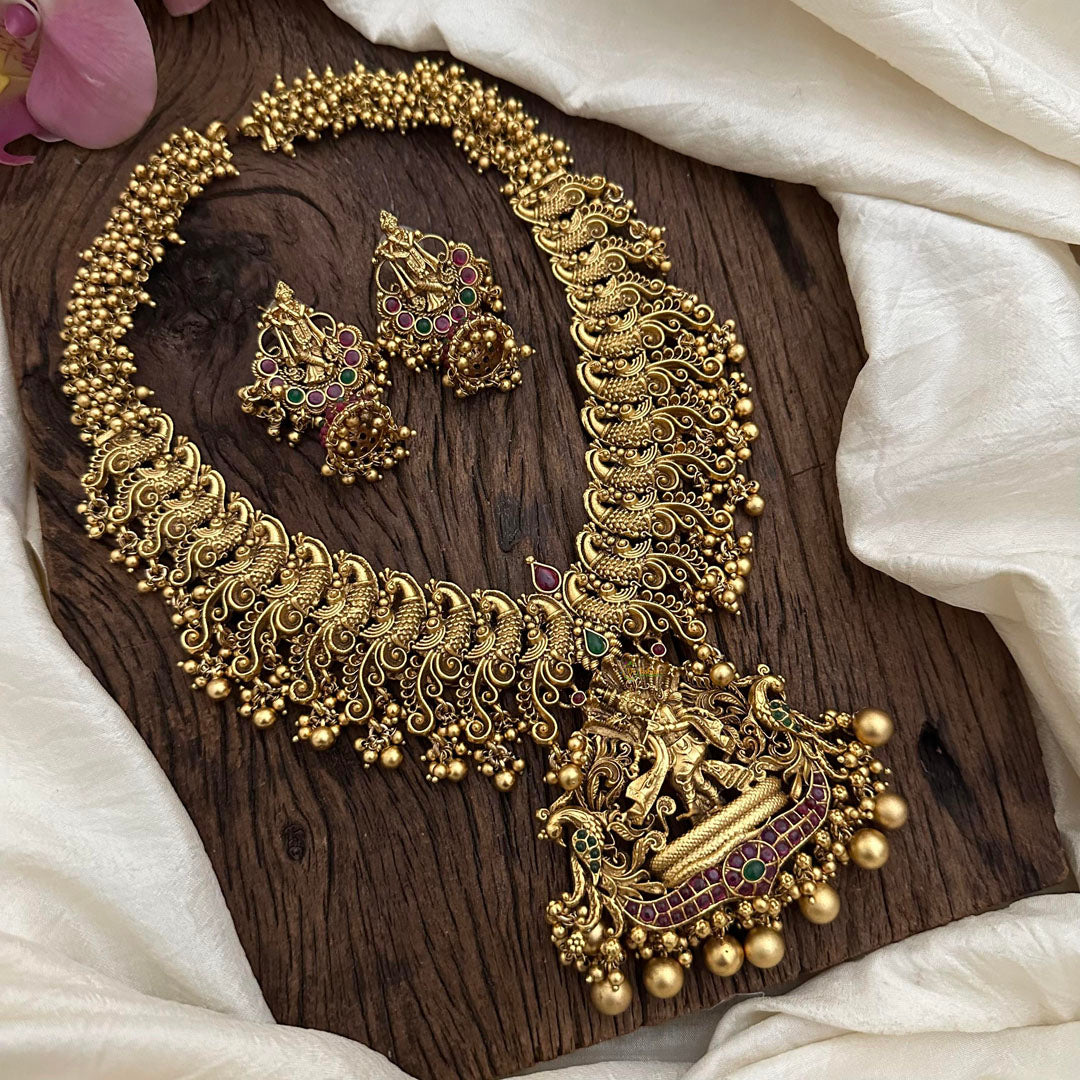 Experience the divine with our stunning Antique Krishna on Kaliya Naag Pendant Long Haram. Crafted with intricate details and a golden bead, this pendant not only adds a touch of elegance to your look, but also symbolizes the powerful story of Krishna defeating the serpent Kaliya. Grace your neck with this piece and feel the divine energy flow through you. Comes with matching earrings.
