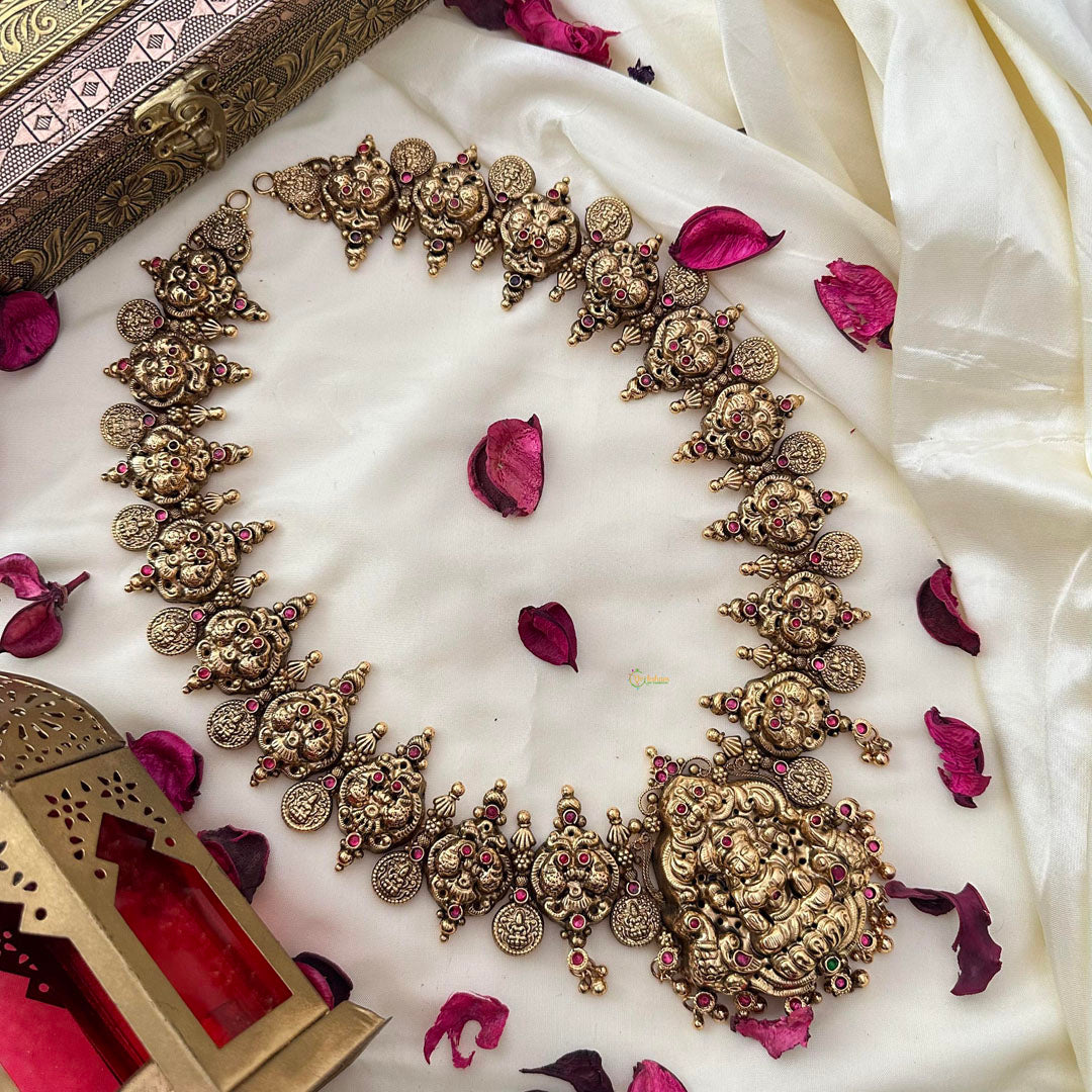 Indulge in timeless elegance with our Antique Lakshmi Coin 1 gm Gold Haram. Adorned with a beautiful peacock and featuring a stunning Lakshmi pendant, this haram embodies luxury and sophistication. Made with 1 gm of gold, it's the perfect addition to your collection.