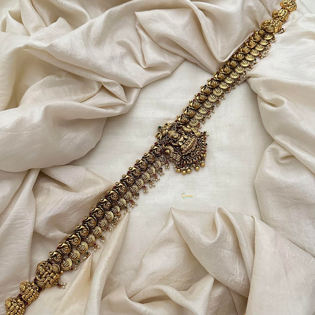 Elegant and exclusive, this Antique Lakshmi Coin Bridal Hip Chain is a must-have for any bride. The peacock chain, adorned with a center Lakshmi pendant and delicate pearls, exudes traditional charm. The touch of red and green stones adds a pop of color, making it a stunning piece to complete your wedding attire.