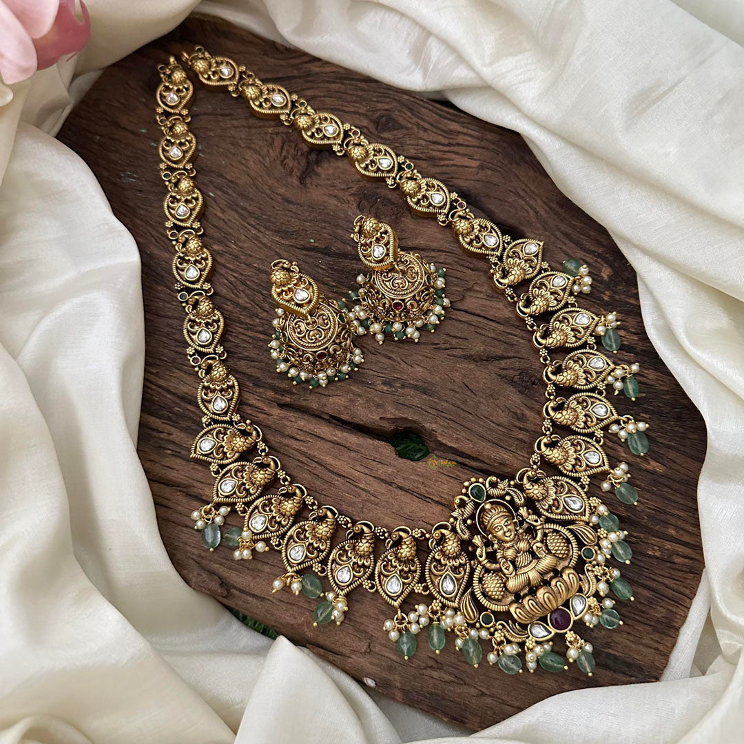 Elevate your style with our Antique Lakshmi Haram-Pastel Green Beads-Pearls set. The stunning haram necklace is adorned with intricate Lakshmi motifs, while the pastel green beads and pearls add a touch of elegance. Complete the look with the included matching earrings. Perfect for adding a touch of timeless beauty to any outfit.