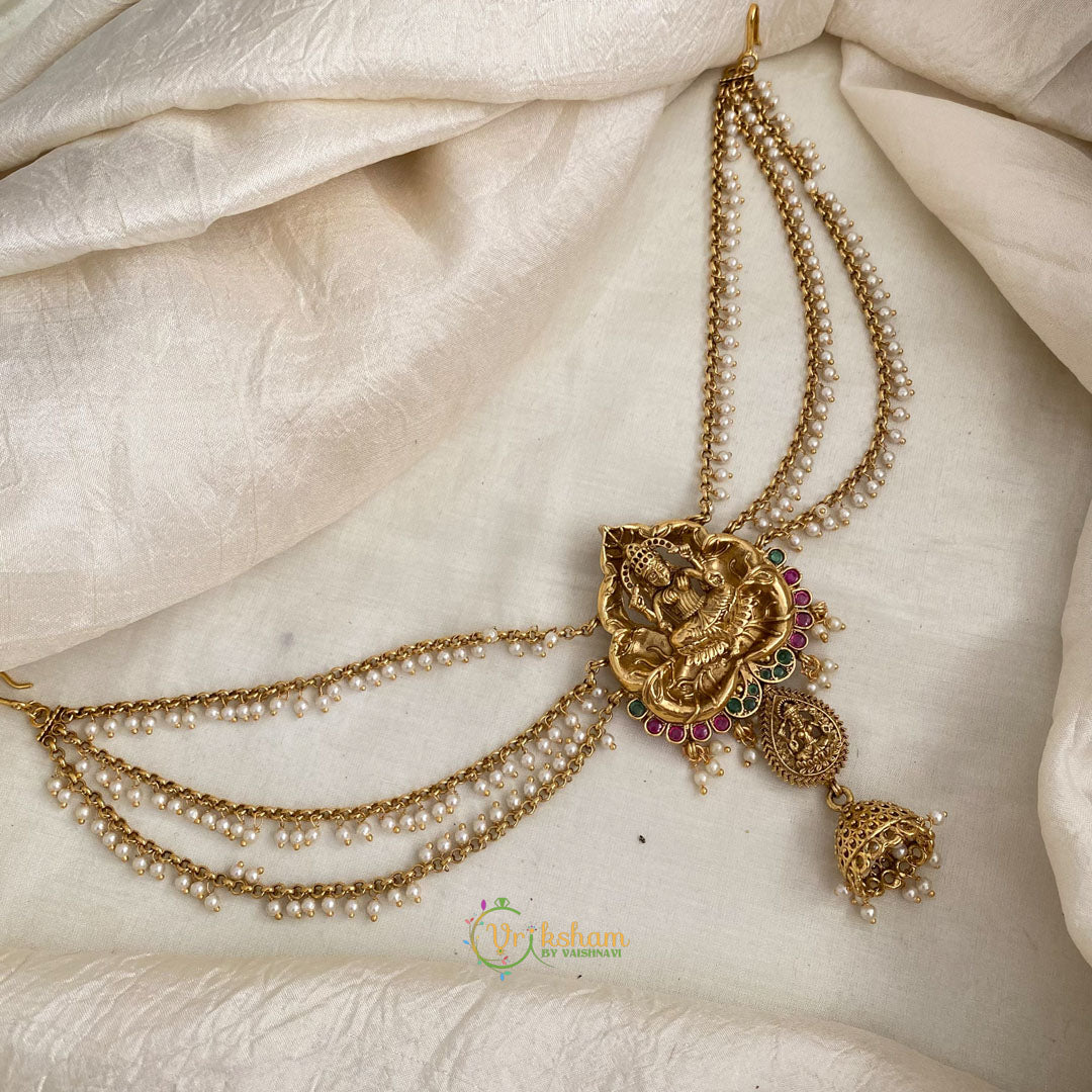 Antique Lakshmi Jada Bun Billai with Maatil - Pearl Maatil - Jhumka - Bridal Hair accessory. This ornate hair ornament typically features a Lakshmi deity motif, symbolizing prosperity and auspiciousness. These chains known as Maatil not only add visual appeal but also enhance the traditional charm of the piece. Jhumkas are iconic elements of Indian jewelry, known for their intricate craftsmanship and timeless appeal.