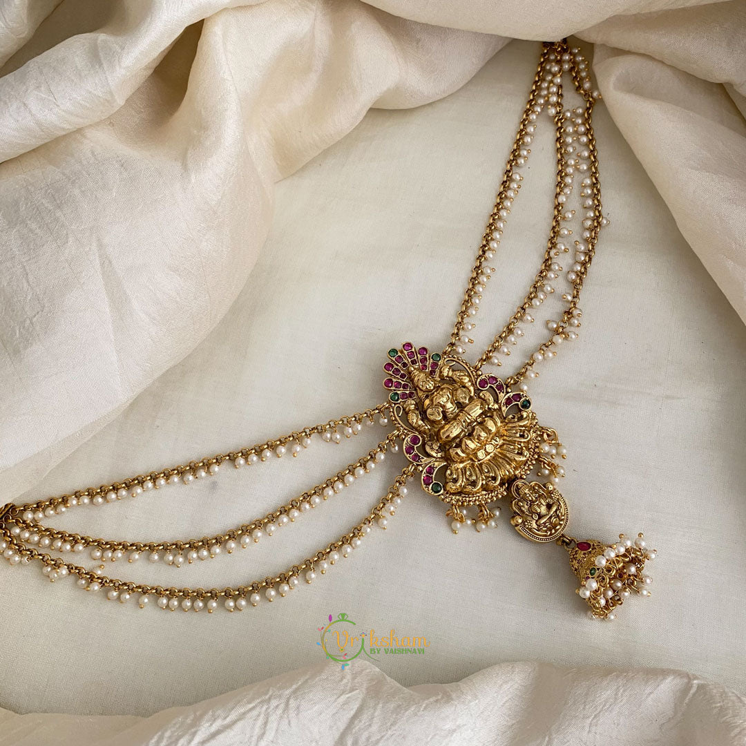 Antique Lakshmi Jada Bun Billai Maatil - Pearl Maatil - Jhumka - Bridal Hair accessory.The Antique Lakshmi Jada Bun Billai Maatil is a mesmerizing hair accessory that embodies traditional elegance and spiritual symbolism. As it motifs, symbolizing strength, wisdom, and auspiciousness in Indian culture.
