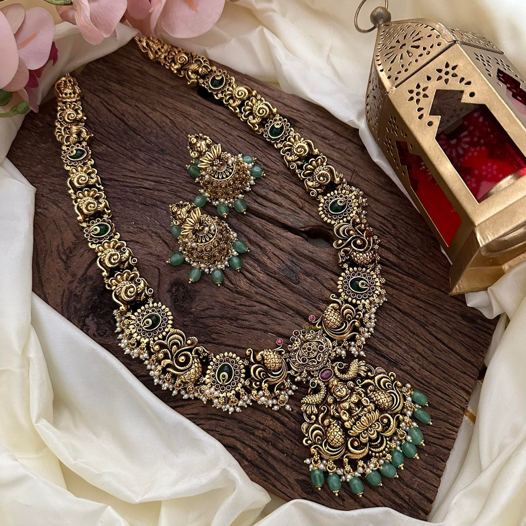 Elevate your look with our Antique Lakshmi Long Neckpiece. Crafted with aqua green beads and luxurious pearls, this statement piece exudes elegance and sophistication. The intricate design featuring the goddess Lakshmi adds a touch of culture and artistry, making it a must-have for any fashion connoisseur.