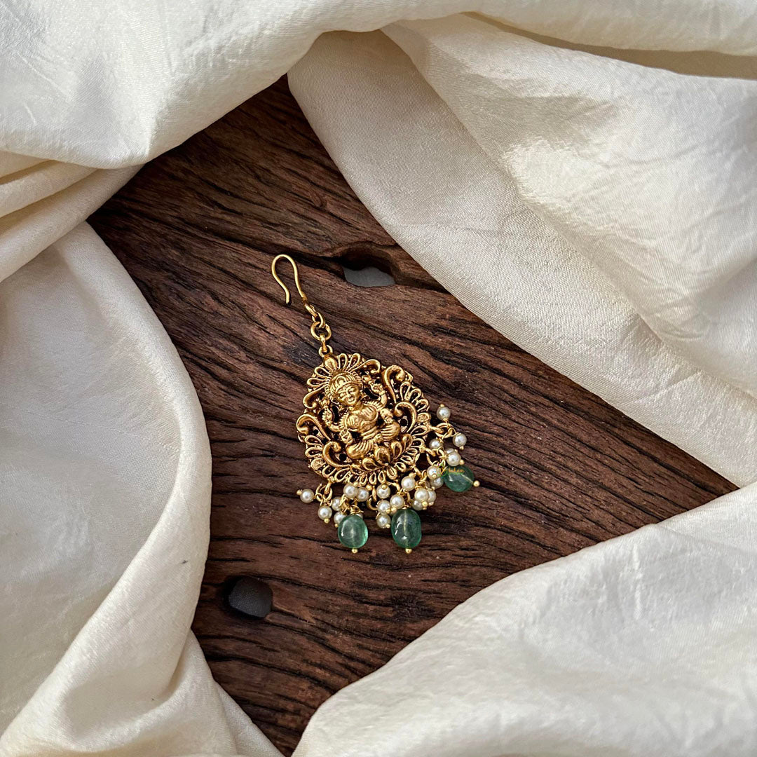 Introducing our exquisite Antique Lakshmi Maang Tikka, adorned with delicate green beads and pearl. This intricate piece is a unique addition to any jewelry collection, offering a touch of ancient elegance and symbolic of prosperity. Elevate your look with this stunning and exclusive accessory.