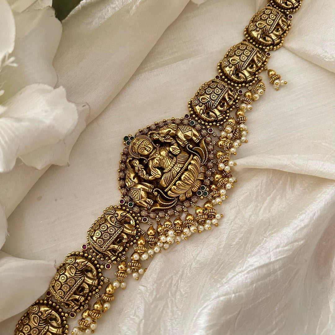 Antique Lakshmi Pendant Hip Chain-Elephant - Elevate your style with our Antique Lakshmi Pendant Hip Chain. It features an intricately designed elephant with a touch of green stones, exuding elegance and luxury. Let this jewelry piece be a symbol of prosperity and grace in your wardrobe.