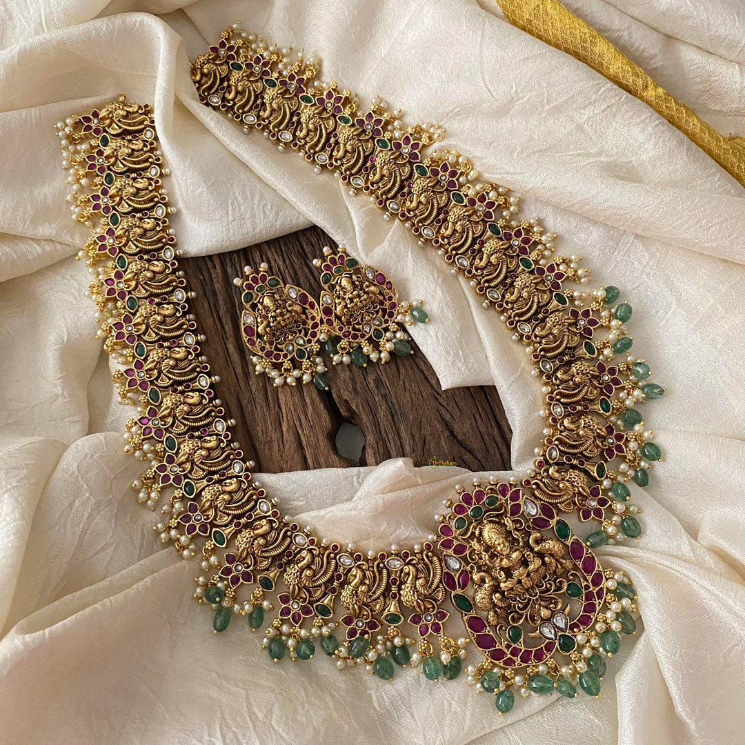 Elevate your style with our Antique Lakshmi Pendant Long Haram. Adorned with a beautiful peacock and floral design, this haram features stunning green beads and delicate pearls. The addition of red, green, and white kemp stones adds a touch of elegance. Perfect for any occasion.