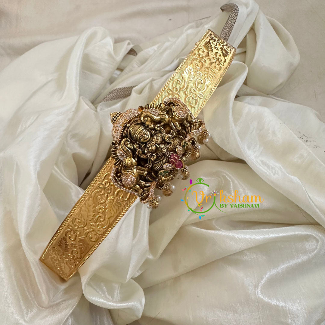 AD Stone Antique Lakshmi Pendant Plain Hipbelt in center; ad stone and semi precious studded hipbelt. MAKE MATERIAL – AD Stone Antique Lakshmi Pendant Plain Hipbelt is made of copper...