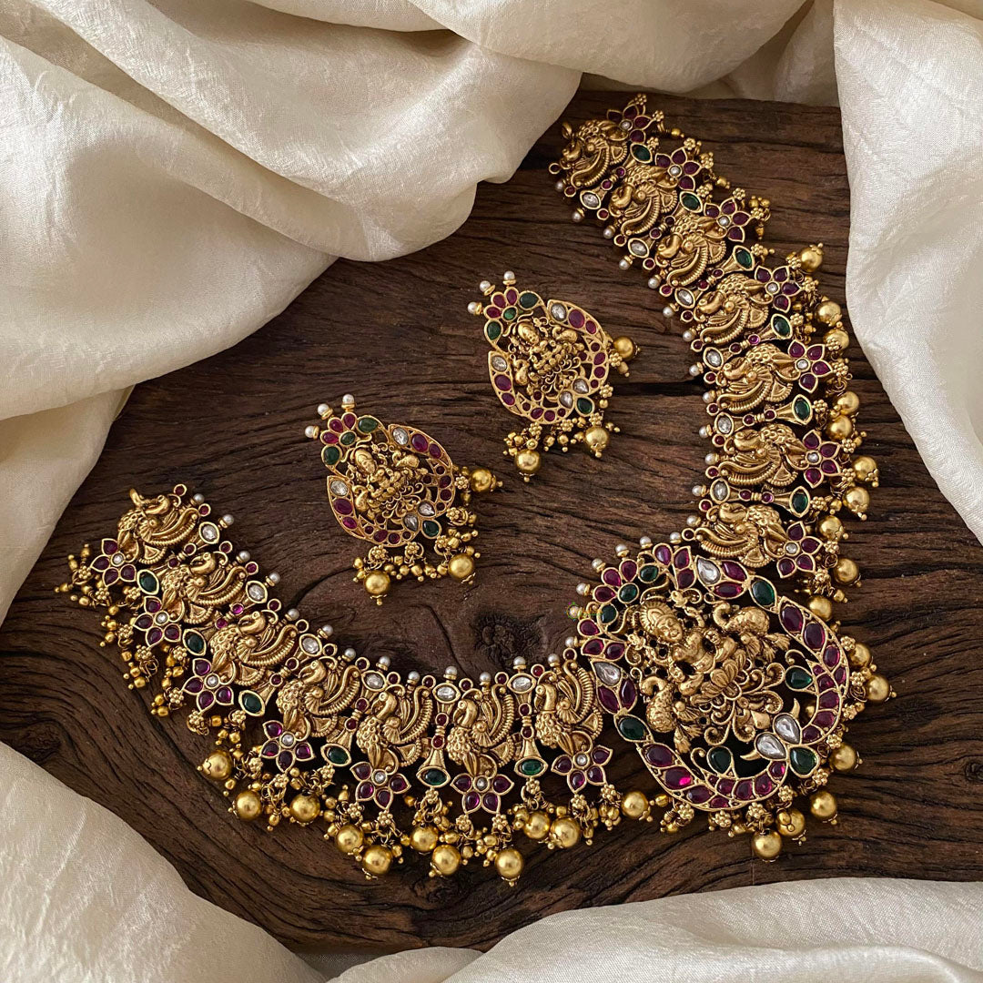 Elevate your style with our Antique Lakshmi Pendant Short Haram. Adorned with a beautiful peacock and floral design, this haram features stunning ghungroo. The addition of red, green, and white kemp stones adds a touch of elegance. Perfect for any occasion.