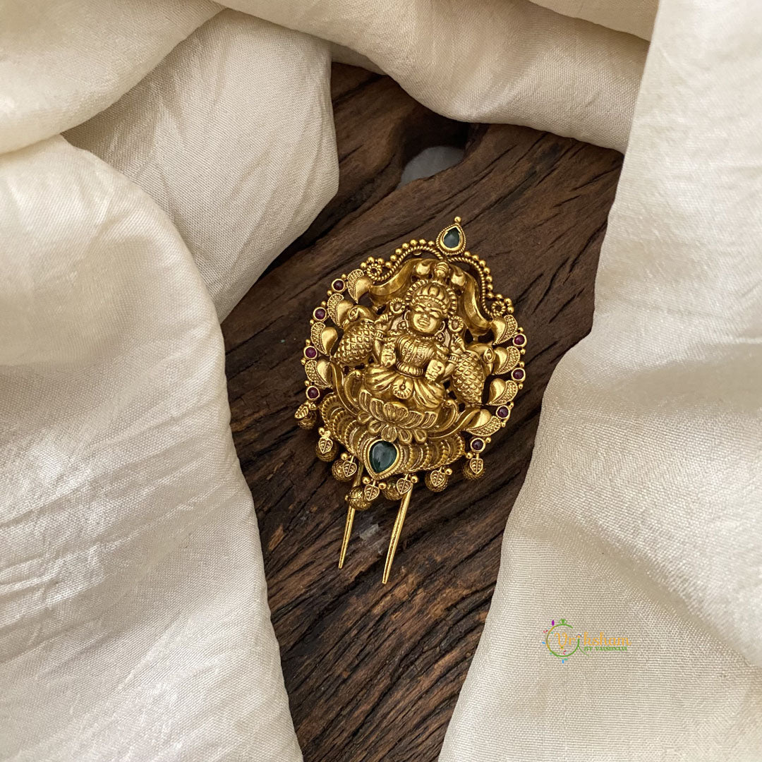 Antique Lakshmi Single Jada Billai-Bun Billai- hair accessory for festive braids hairstyling. Finishing done with touch of red and green stones as well as golden pearls are used.