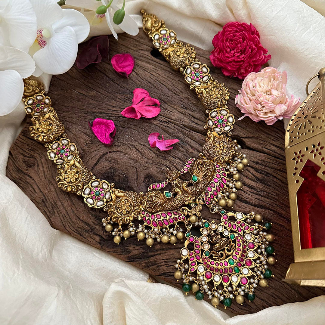 Indulge in the opulence of our Antique Look Alike Jadau Kundan Temple Haram. Adorned with lustrous pearls and intricate green & gold beads, this piece exudes luxury and elegance. A true masterpiece that will elevate any ensemble and make you feel like royalty.