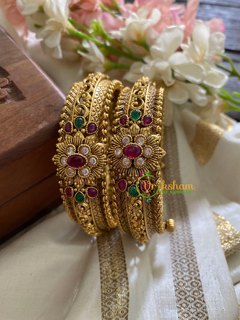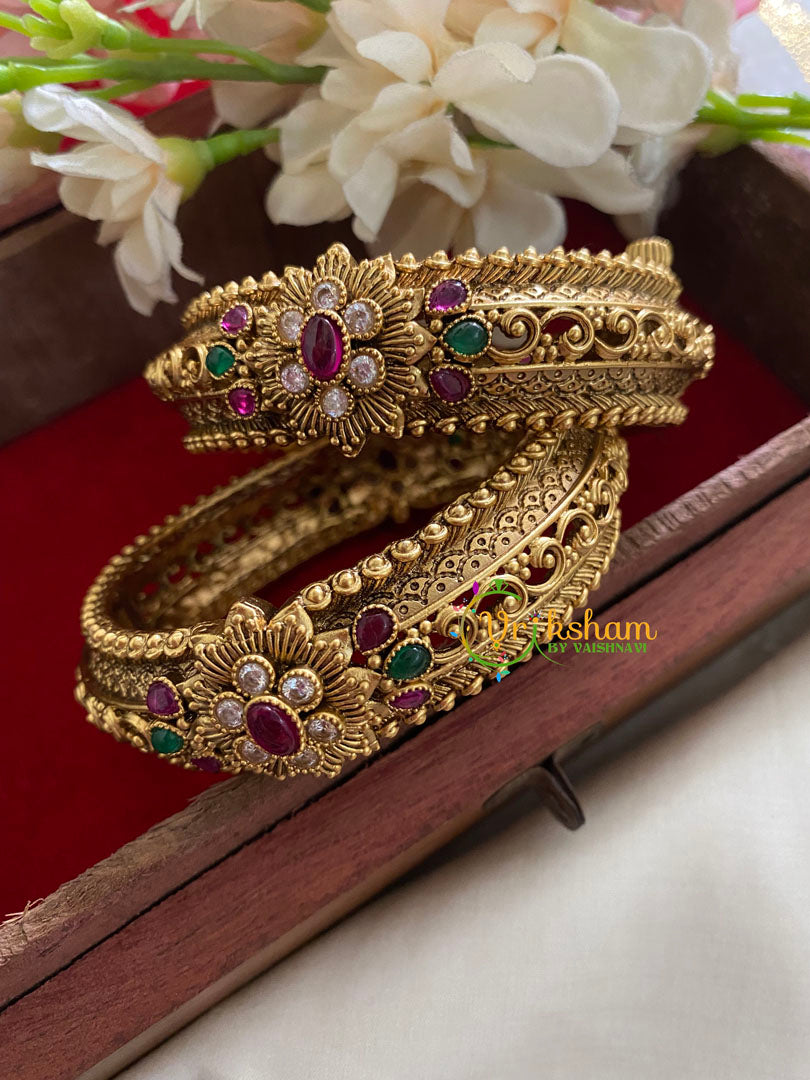 Premium Antique Openable Kada Bangle-AD Stone Floral– openable Kada type. Red Green AD Stone studded design, comes as a Pair bangle only.