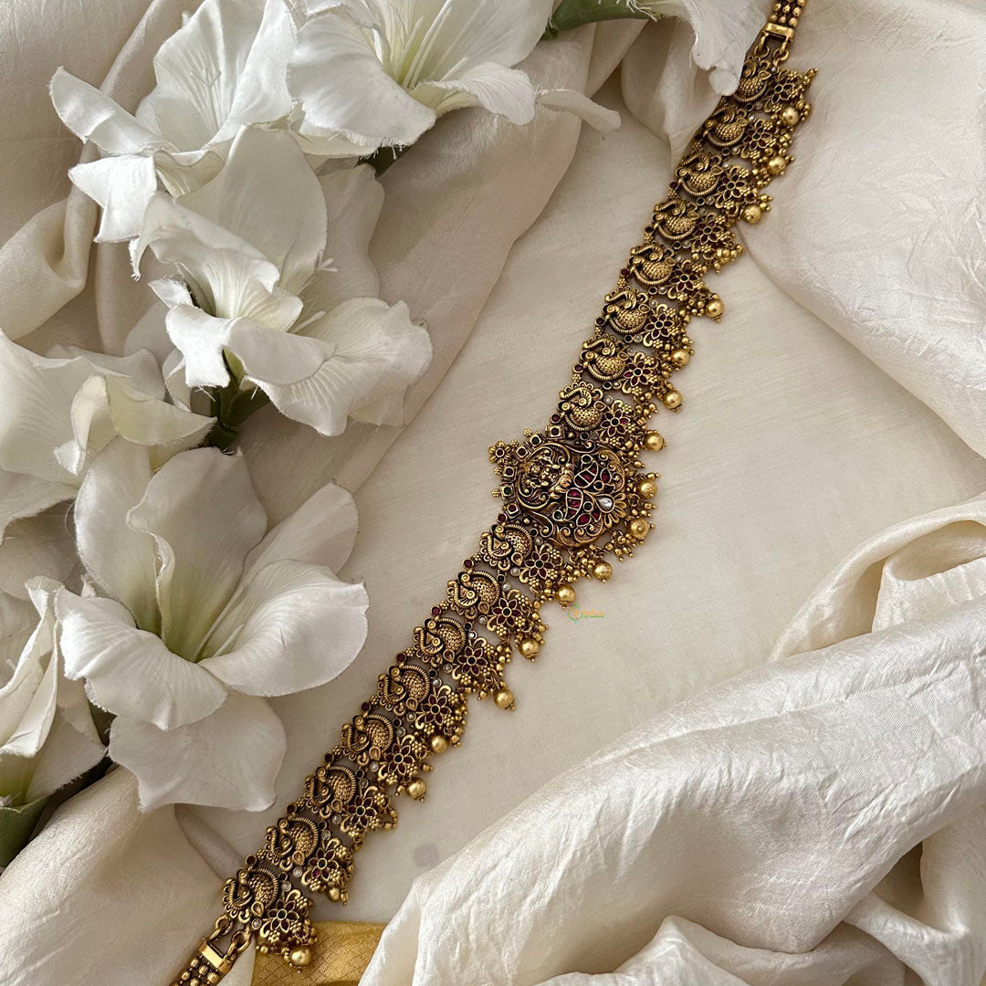 Antique Peacock Lakshmi Pendant Hip Chain-Ghungroo - This exquisite Antique Peacock Lakshmi Pendant Hip Chain features a dual peacock design adorned with red, green, and white stones, and finished with a delicate ghungroo chain. Add a touch of elegance and tradition to any outfit with this unique accessory.