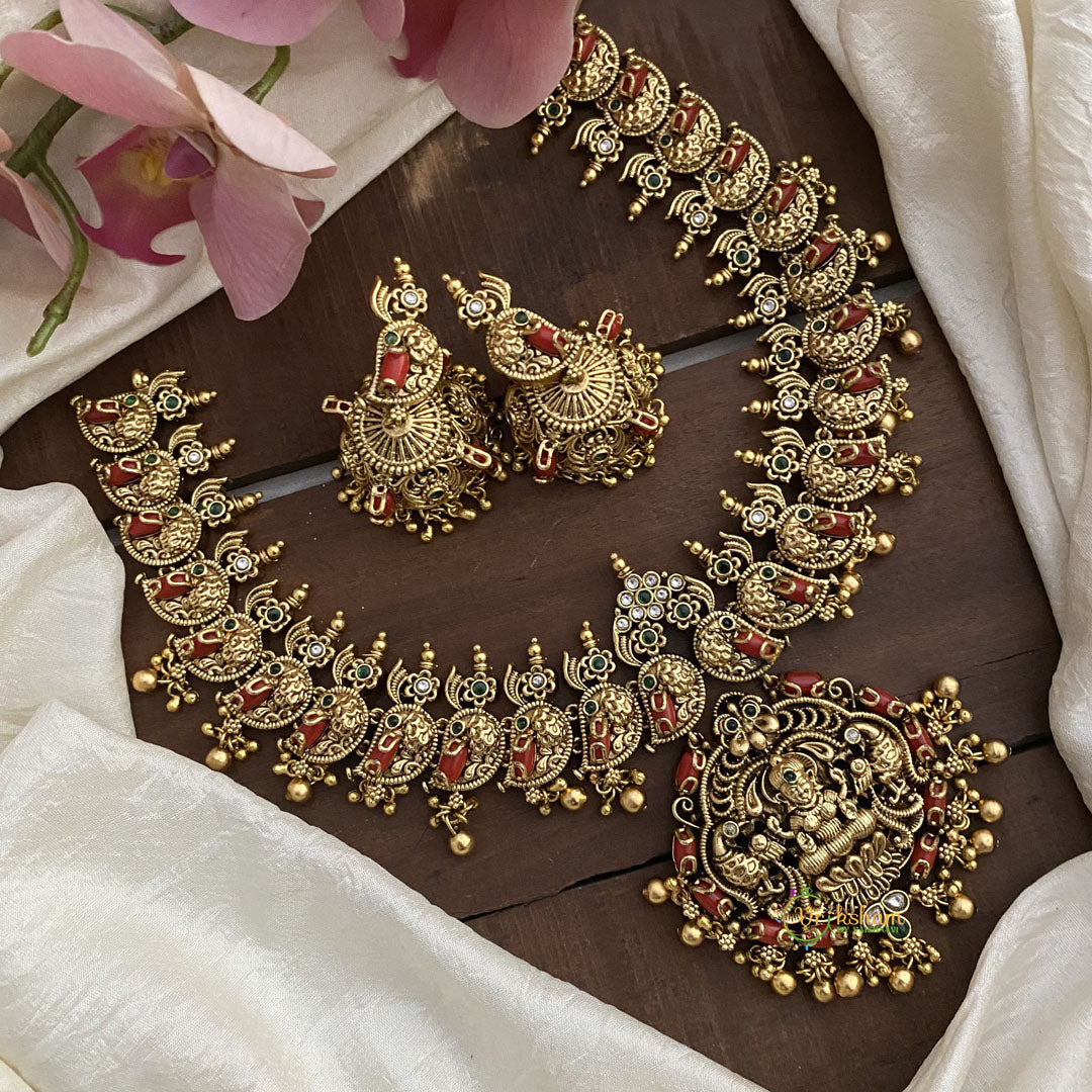 Indulge in the luxury of our Antique Peacock Lakshmi Short Neckpiece. Adorned with intricate golden beads, this handcrafted necklace features a stunning peacock design, inspired by the goddess Lakshmi. Elevate your style with this sophisticated and exclusive piece, perfect for any special occasion. Comes with matching earrings.