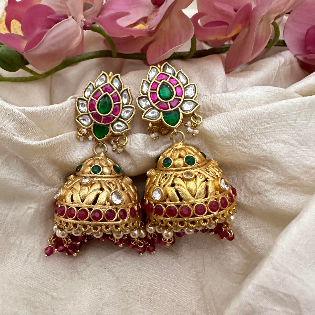Discover the timeless beauty of our Antique Polish Jadau Kundan Jhumkas. Adorned with red beads and pearls, these earrings exude elegance and sophistication. The intricate craftsmanship and antique polish make them a unique addition to any jewelry collection. Elevate your style with these stunning Jhumkas! The back screw design ensures a secure and comfortable fit.