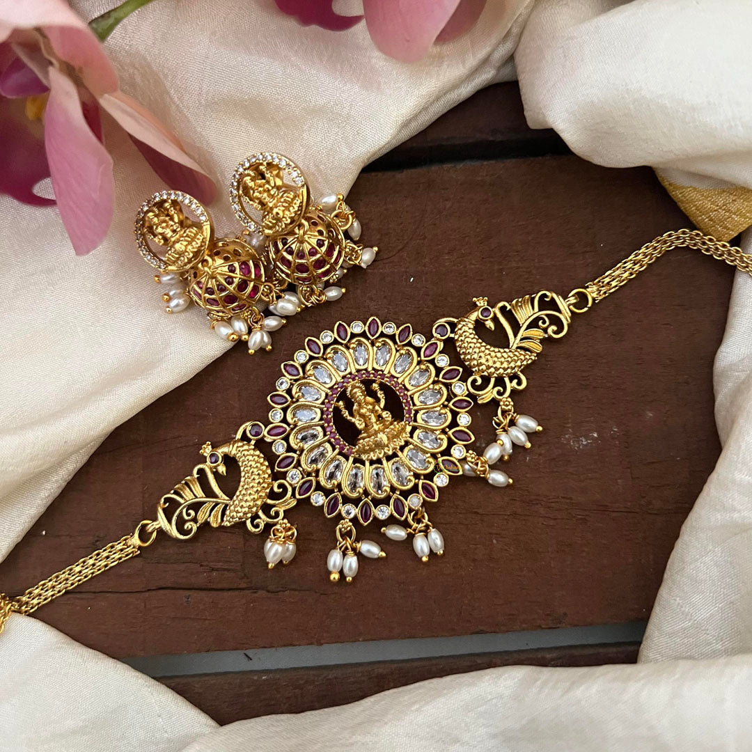 Elevate your jewelry collection with our Antique Red Ad Stone Lakshmi Choker! Adorned with intricate Lakshmi design and rice pearls, this temple choker exudes elegance and grace. Complete the look with the matching earrings included. Make a statement and feel like royalty with this stunning choker set.