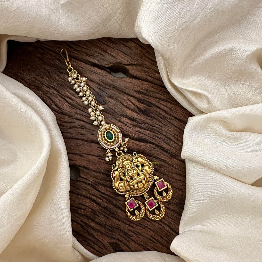 Embrace the opulence of our Antique Red Green AD Stone Lakshmi Maang Tikka, adorned with pearls. This exquisite piece exudes elegance and grace, perfect for any special occasion. Channel the beauty and power of the goddess Lakshmi with this one-of-a-kind accessory.