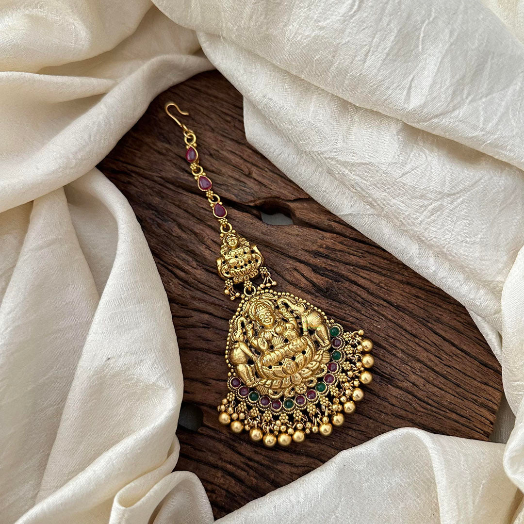 Inspired by ancient goddess Lakshmi, this exquisite tikka features intricate red and green stones set in an antique-gold design. The delicate gold beads add a touch of elegance to this traditional piece, perfect for special occasions and adding a regal touch to any ensemble.