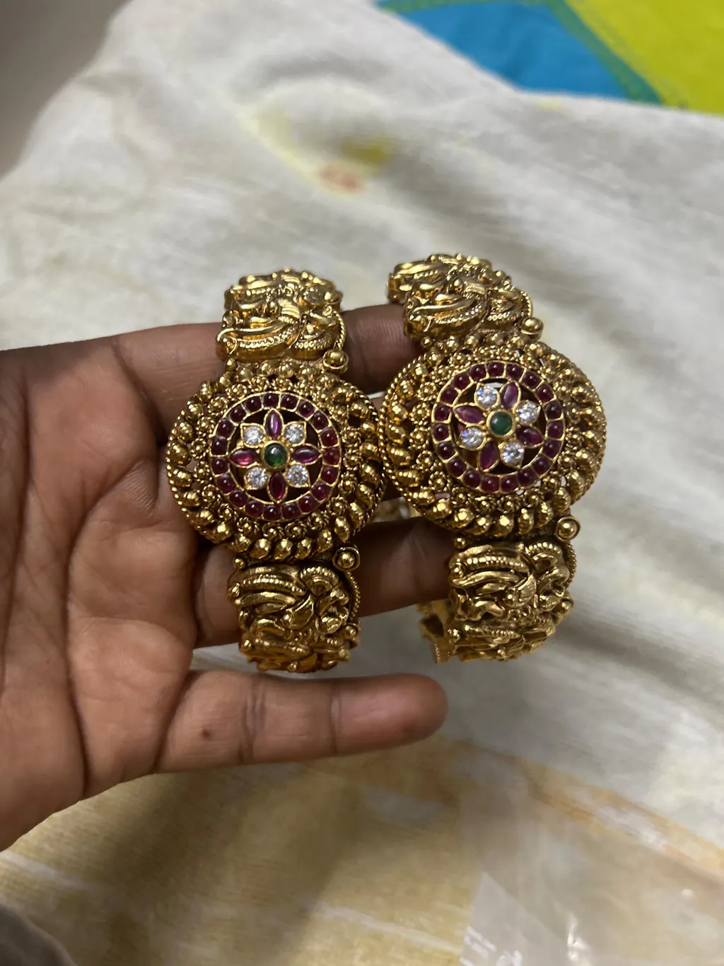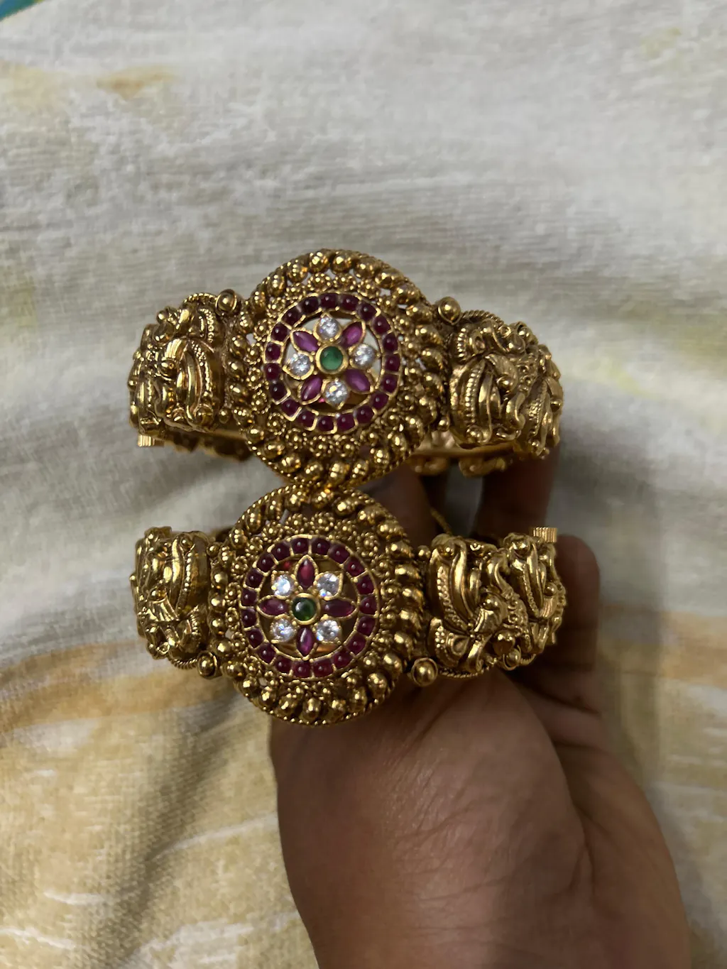 Antique Temple Bangles -Openable kada Bangle – 2 bangle –premium bangle with peacock designed pattern centre green stone and kemp and AD stone imitation stone bangle.