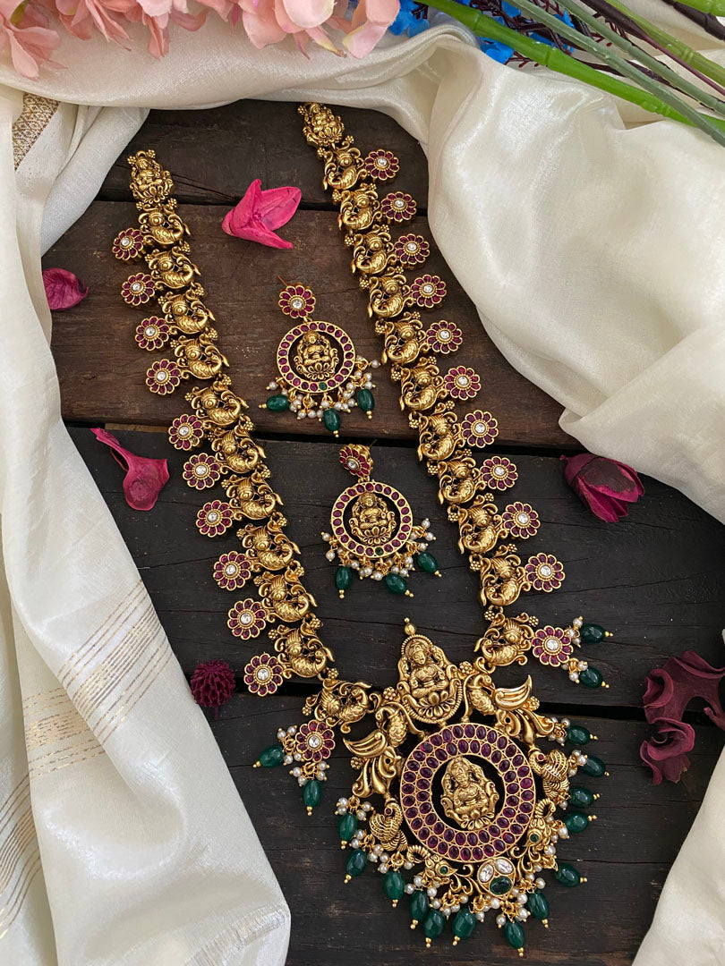 Antique Temple Haram -Lakshmi Haram -premium quality polish and semi precious stones peacock pattern and comes iwth matching earrings. Green Bead Finish.