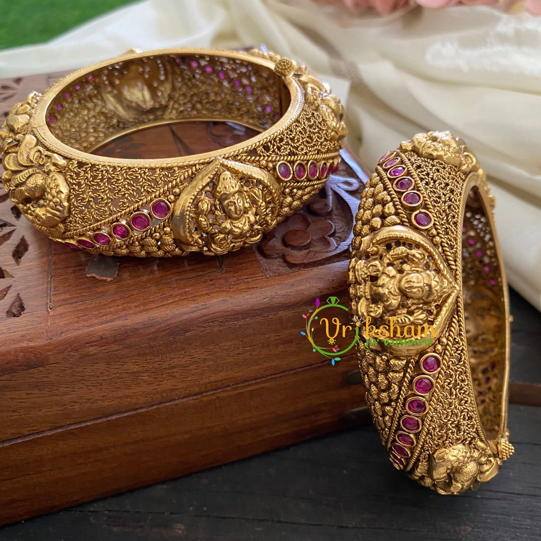 Premium Antique Temple Lakshmi Bangles- Broad bangles with lakshmi idols. Openable screw type; Antique gold look alike polish of premium qualityc omes as a pair only.